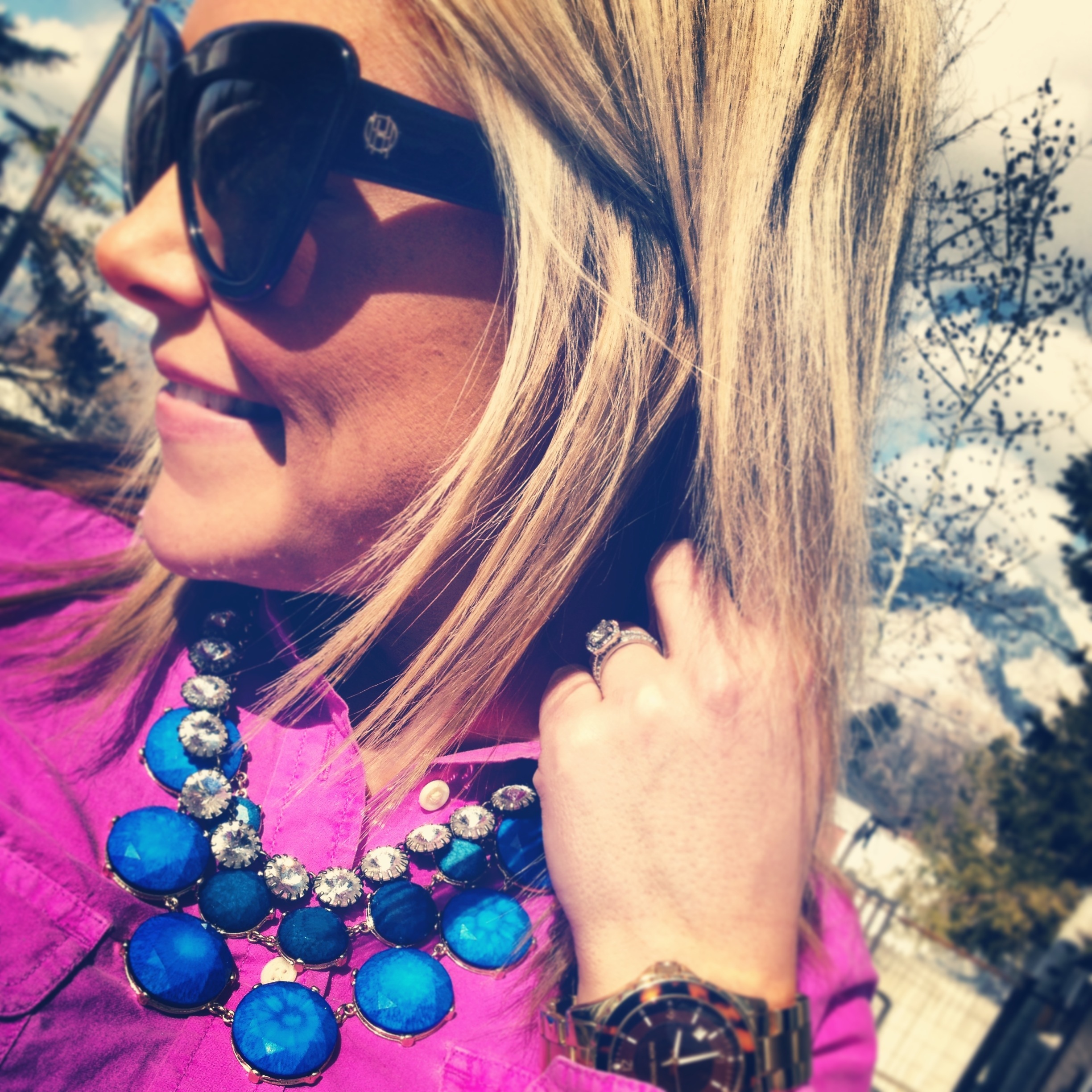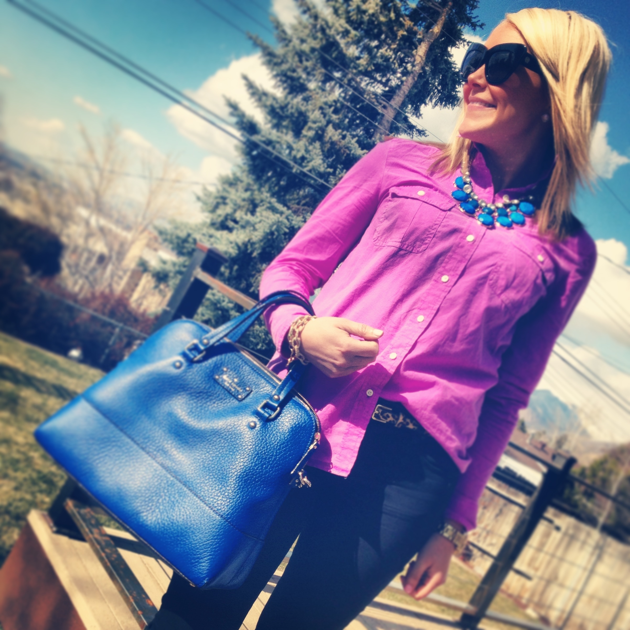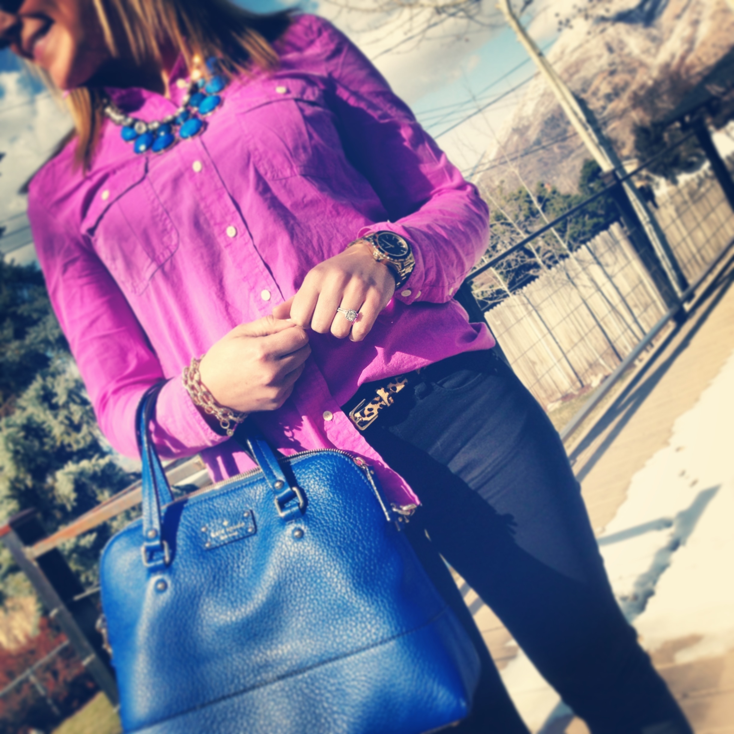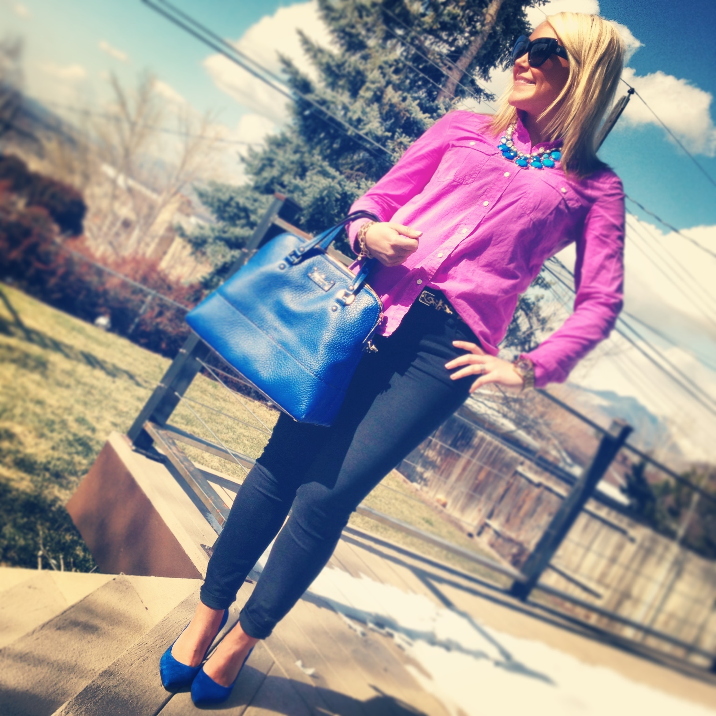 Ok, ok so even though it’s been really cold and rainy here, don’t mind the background of these photos, because we don’t actually have any snow on the ground here in the SLC (well at least in the valley!). But rather, I was going through my outfit archives and realized that I never shared this little gem of an outfit with you all! And something about the combo of neon purple and rich, cobalt blue made me want to blog about it. I absolutely love mixing two bold colors together-especially these two colors.  They are the perfect pairing to brighten those sometimes dreary spring days…20130520-231232.jpg
