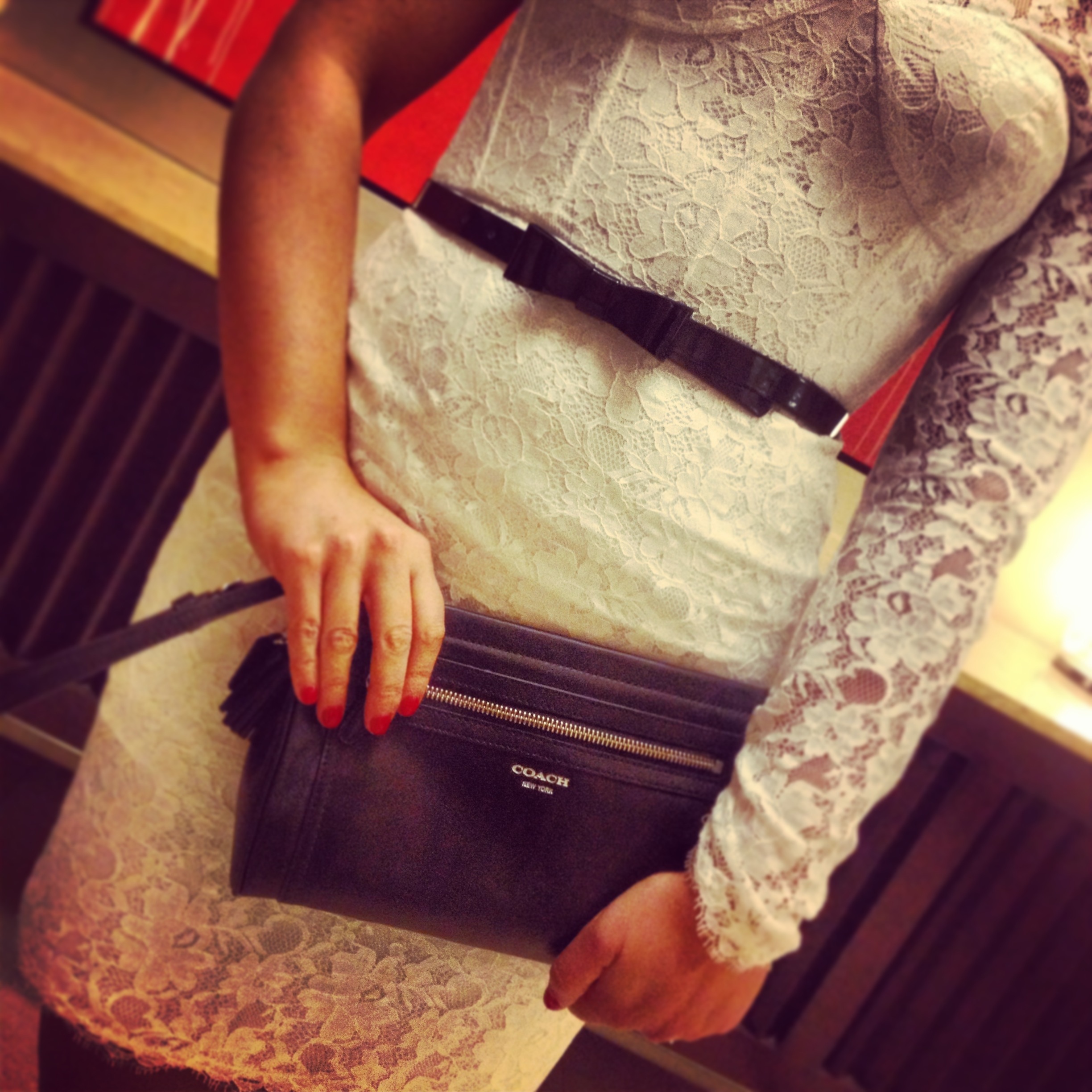 Dress: BCBGMaxazria (amazing Nordstrom Rack find!), similar, similar | Bow Belt: Macy’s, similar | Earrings: Sappari (local boutique in Whitefish, MT), similar | Clutch: Coach Legacy | Pumps: Aldo Dixil