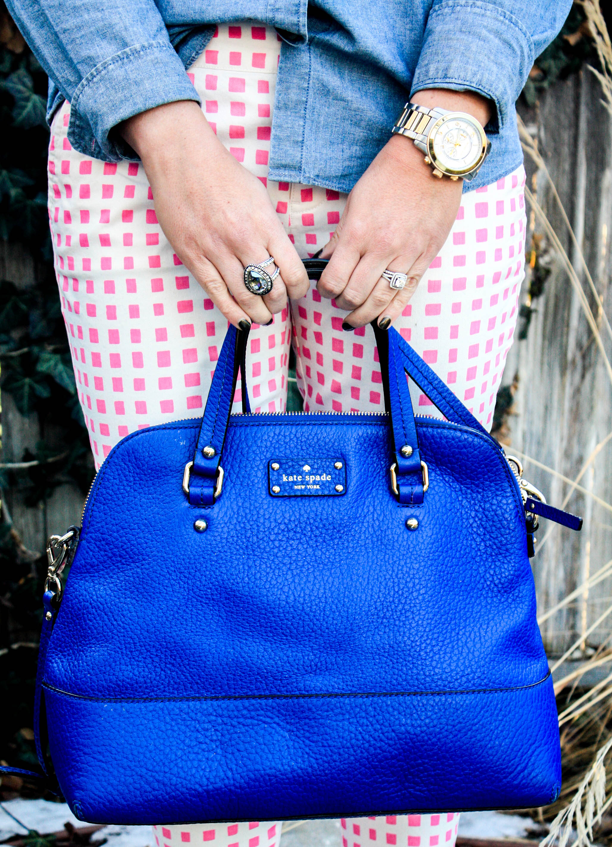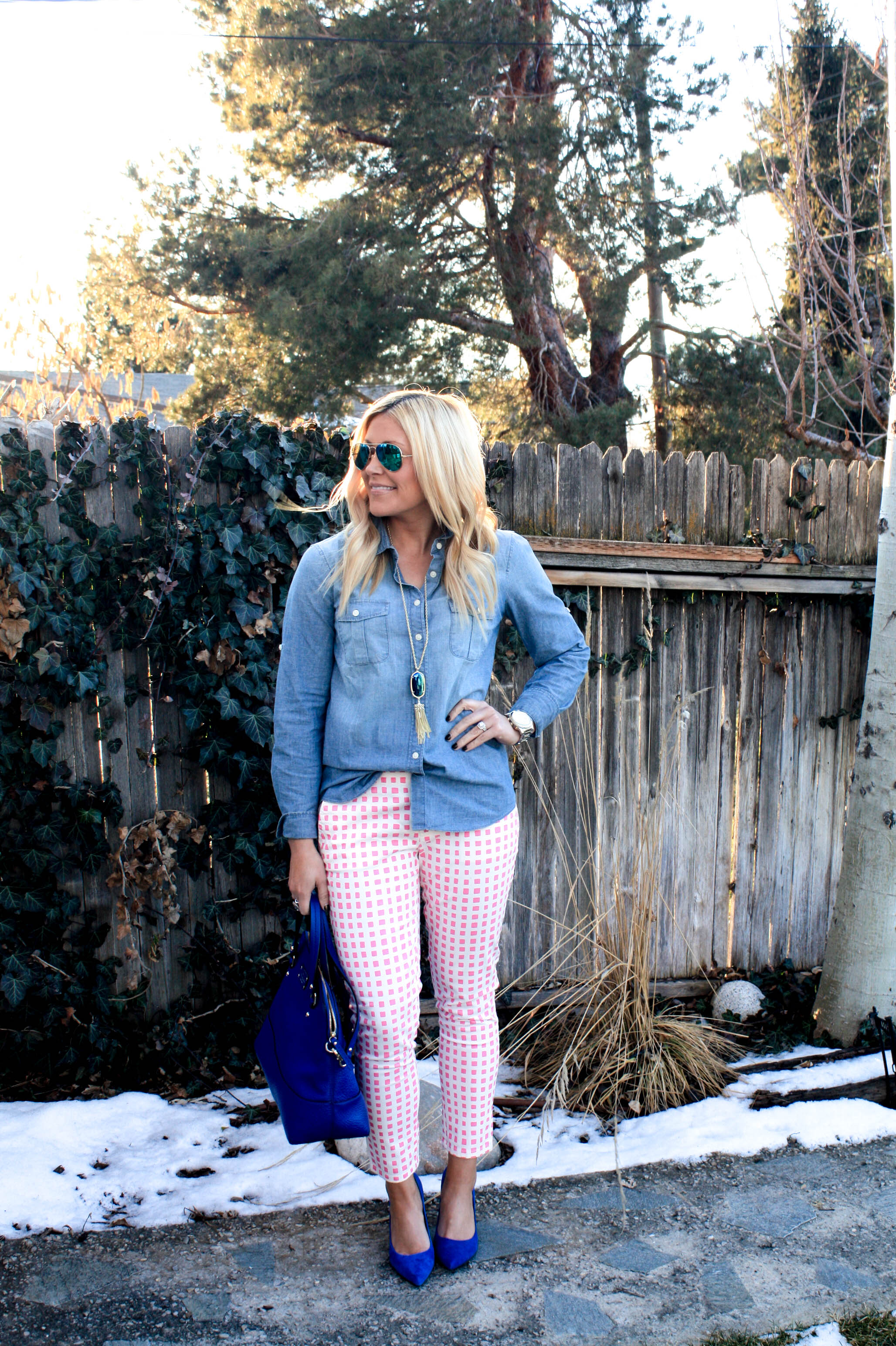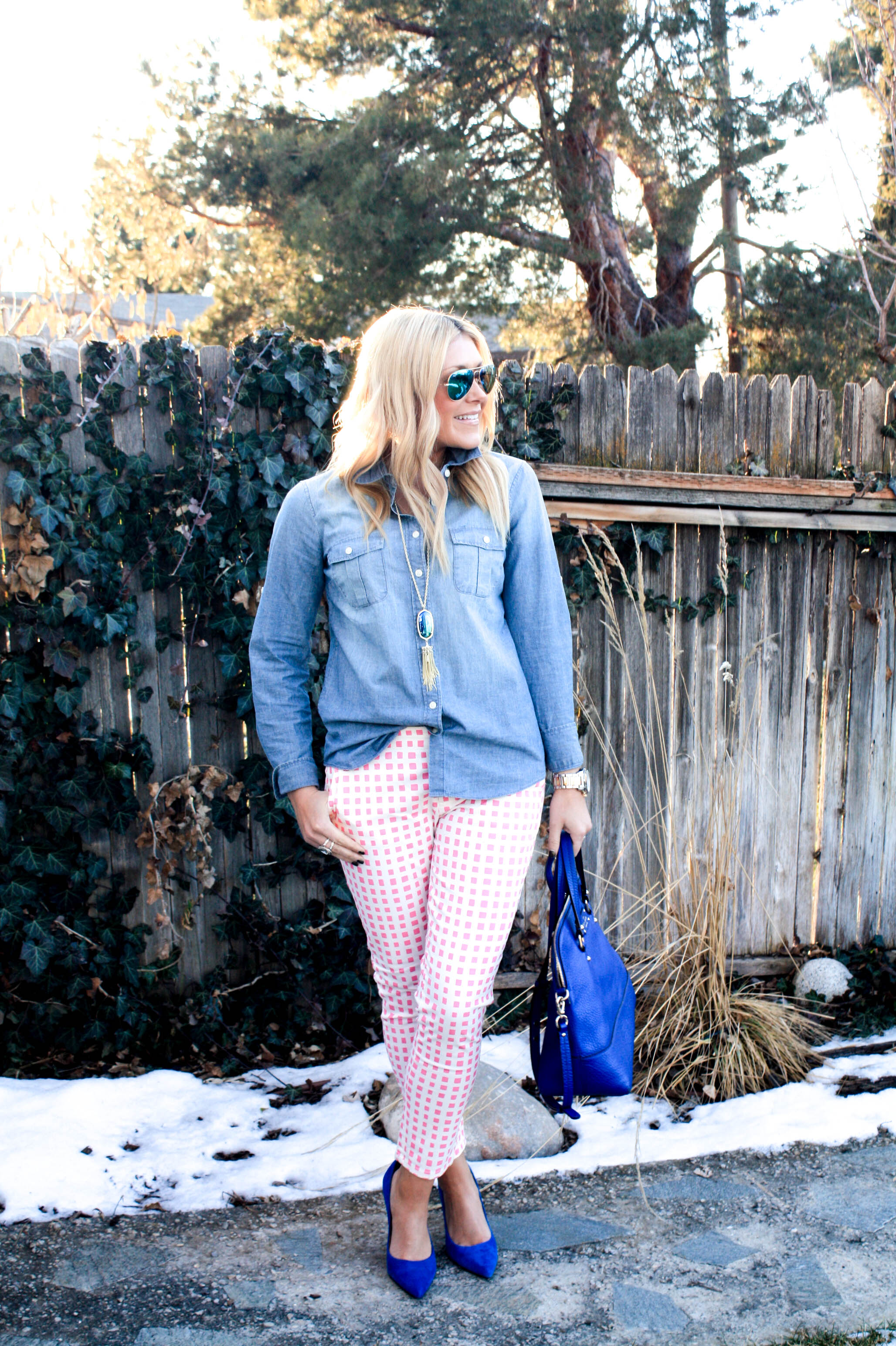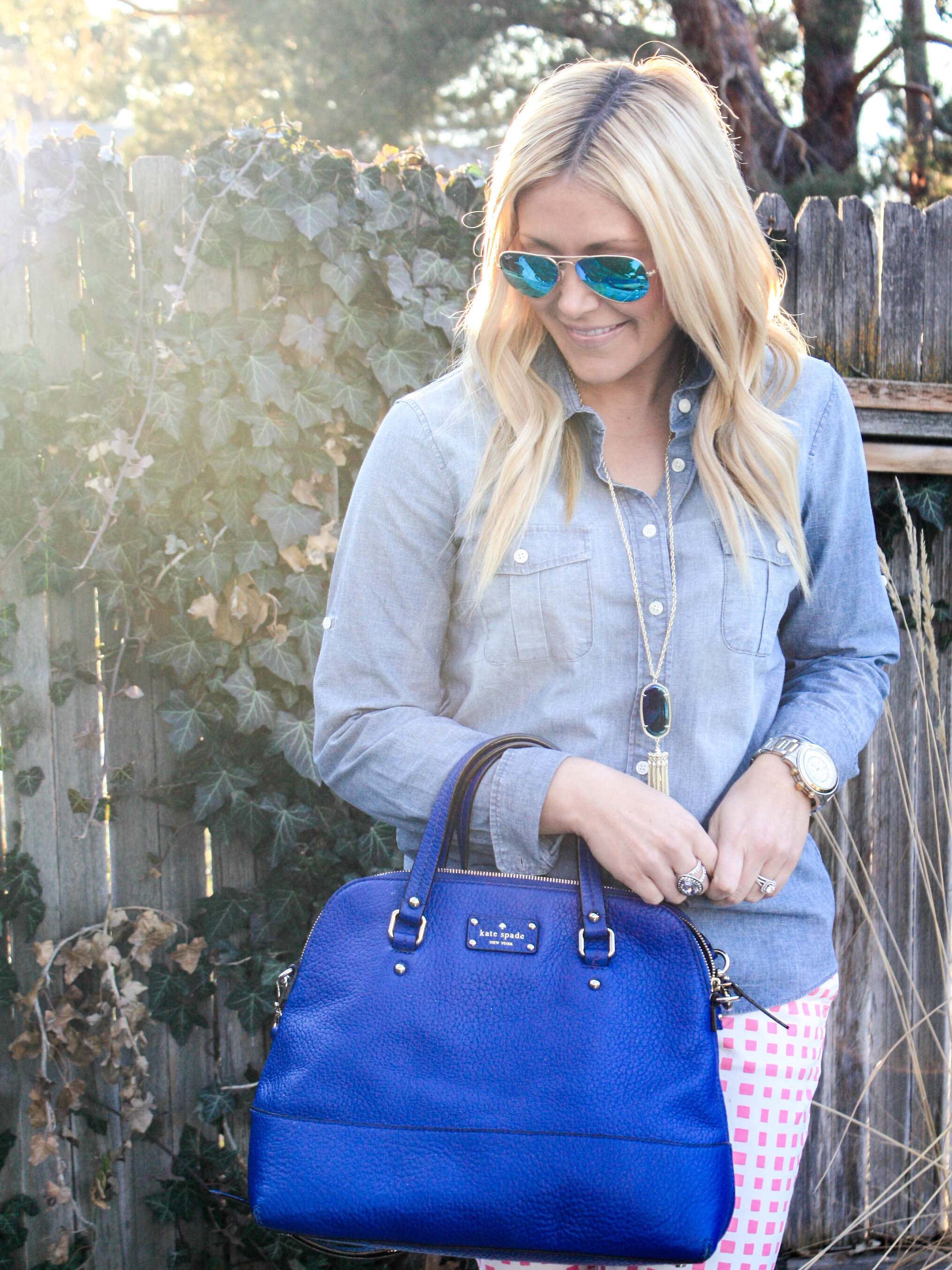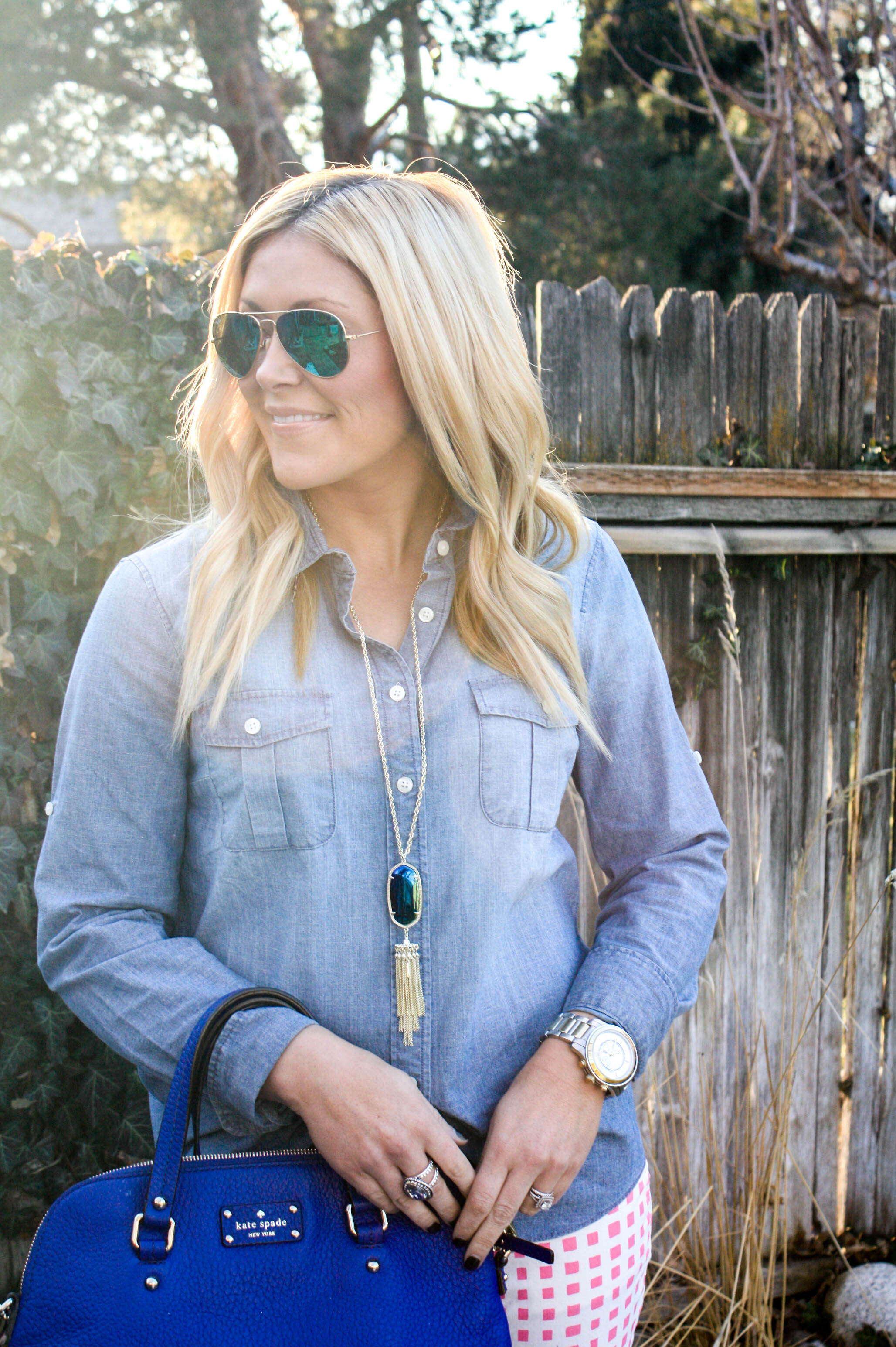 Chambray Shirt: JCrew (on sale for under $40! My fave chambray!) | Printed Pink Pants: Gap (old), similar, similar, LOVE these fun printed pants and these| Necklace: Kendra Scott | Ring: Brighton Collectibles | Watch: Michael Kors | Sunnies: Ray-ban | Bag: Kate Spade (older color), similar, love this | Pumps: Nine West (on sale!)