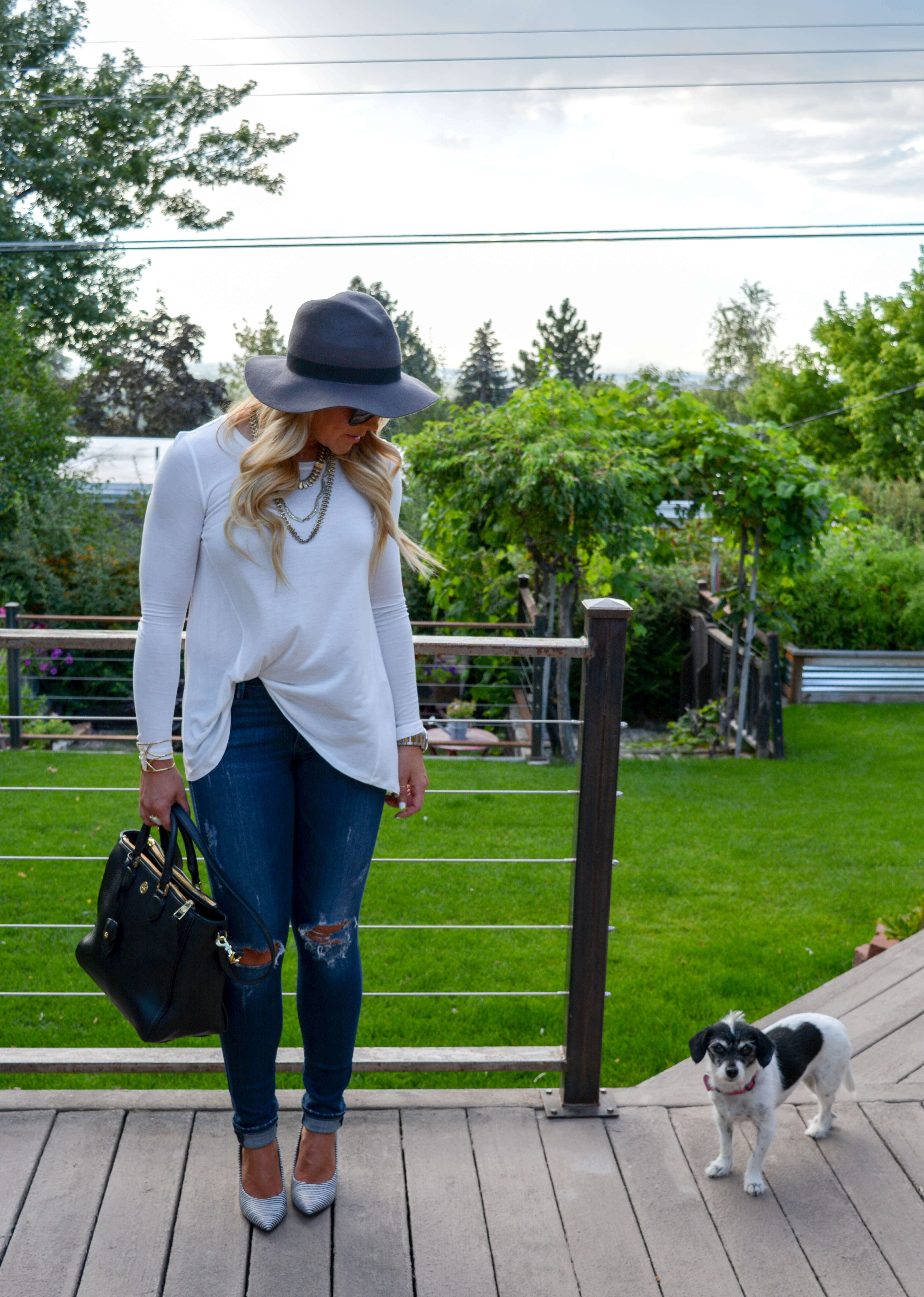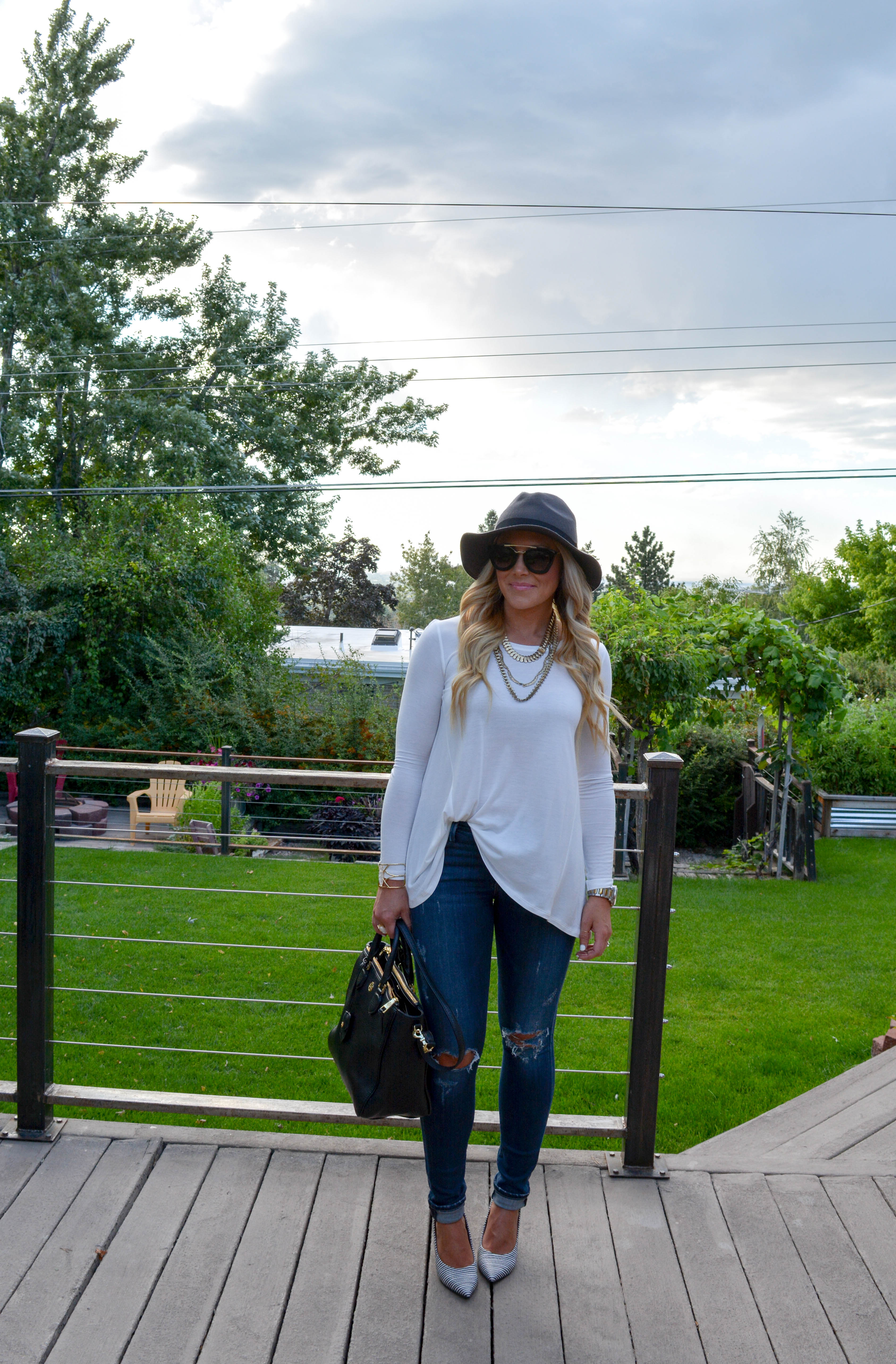 Sweater | Skirt c/o cabi | Necklaces (here and here) | Hat | Sunnies | Booties