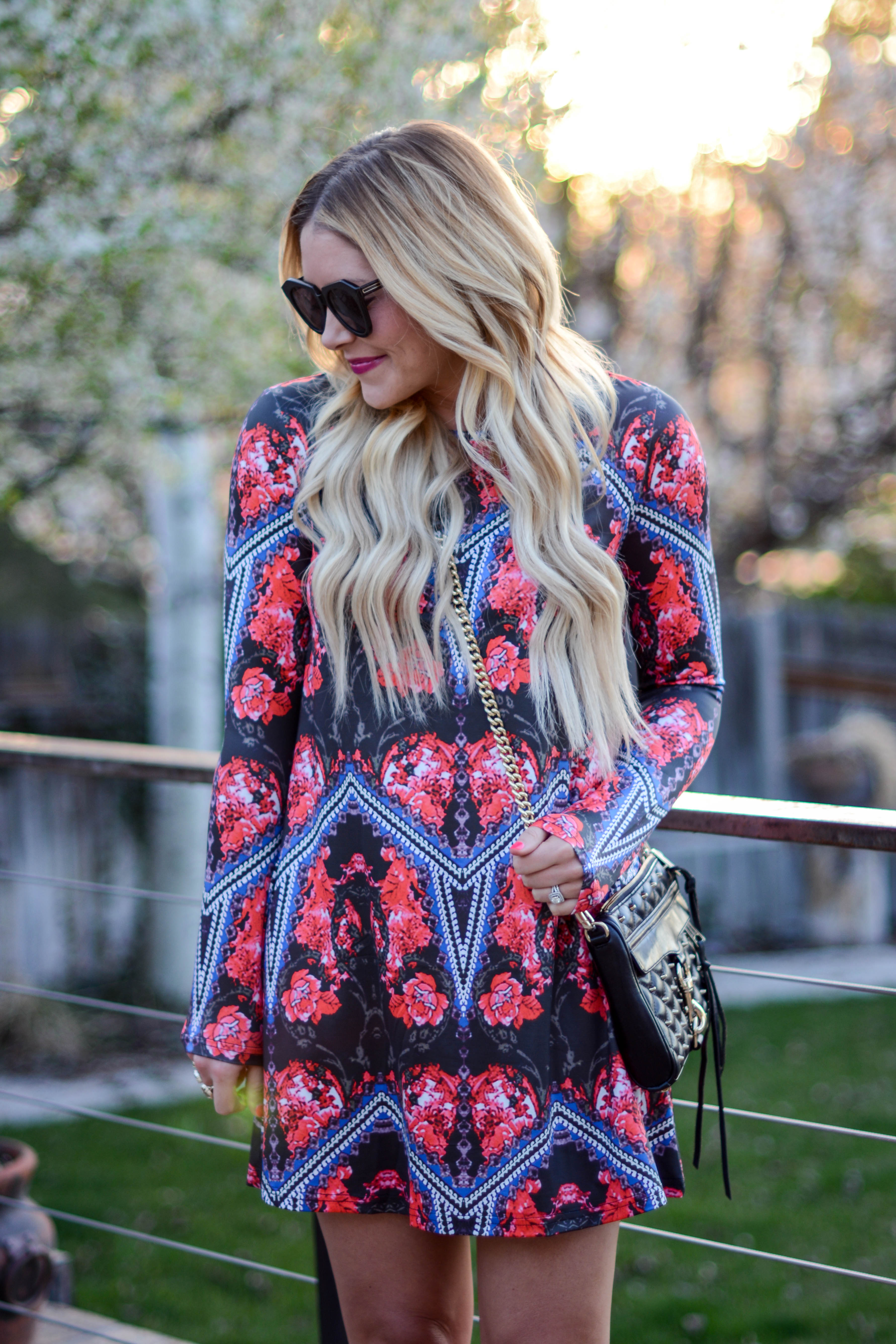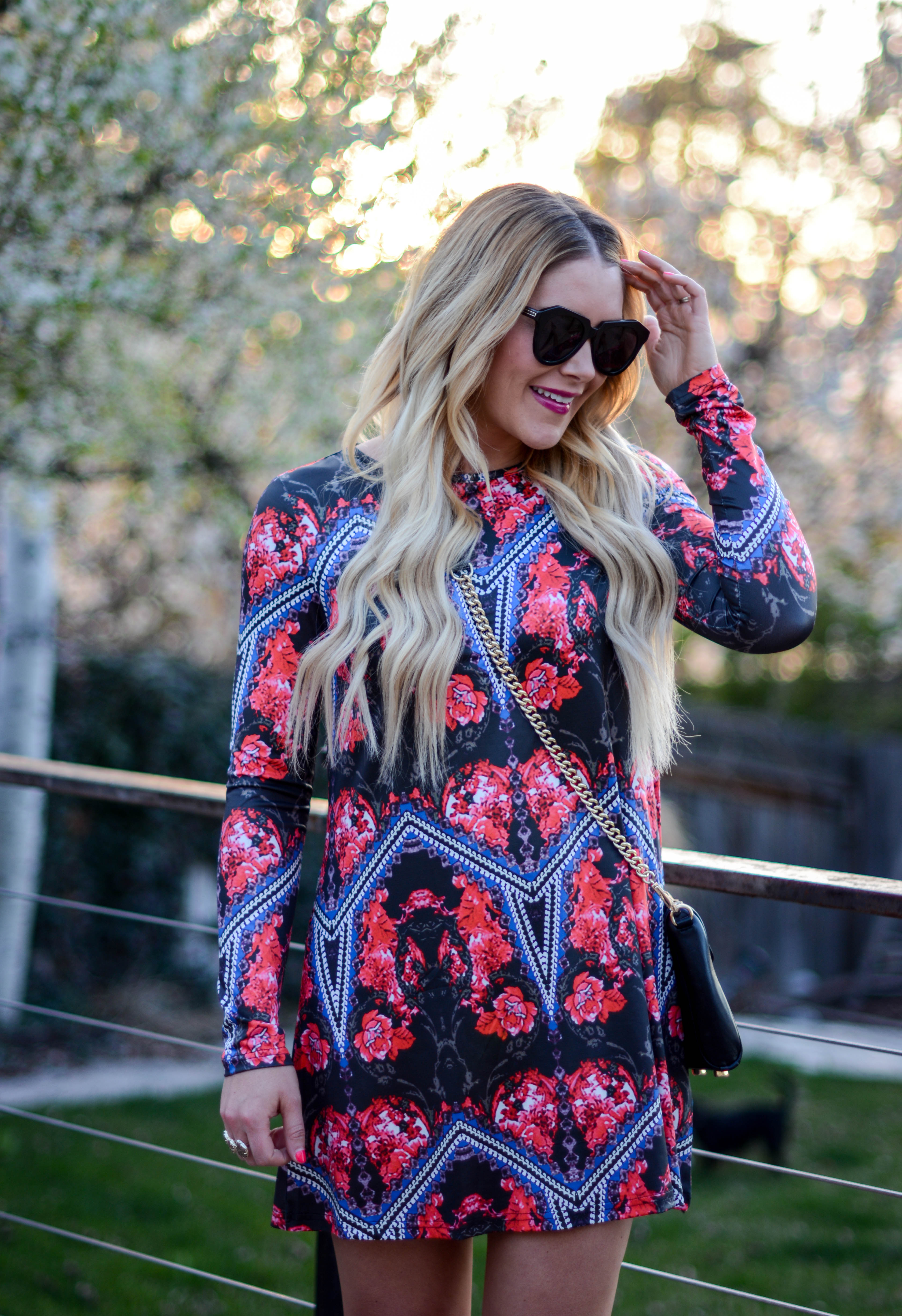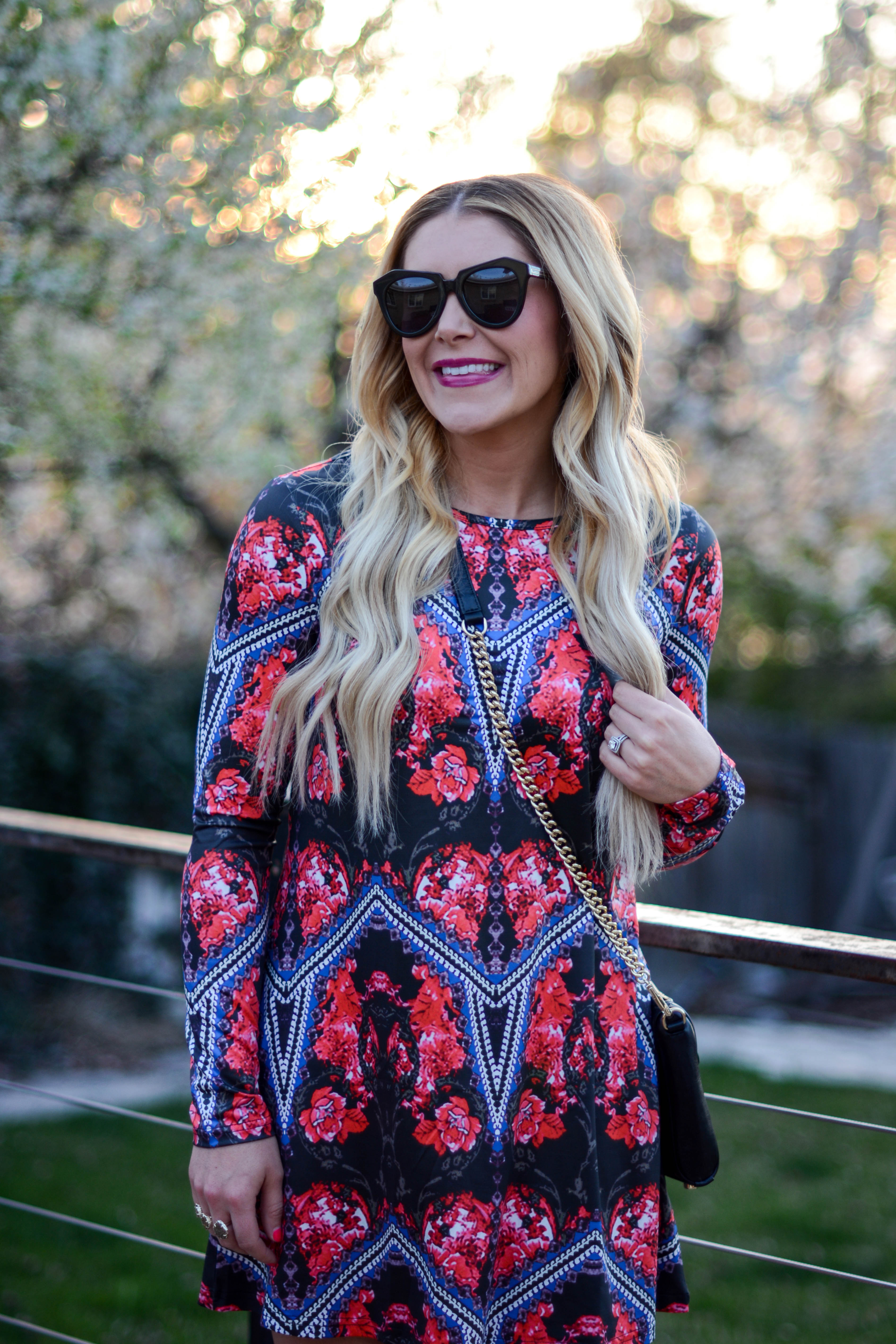 Suede Jacket: Vintage, similar, similar | Dress: Nordstrom | Necklace: Kendra Scott | Clutch: Clare V. | Sunnies: Karen Walker via Ditto (try them for FREE for one month with code: ALLDOLLEDUPBLOG at checkout) | Heels: Sam Edelman (on sale!)