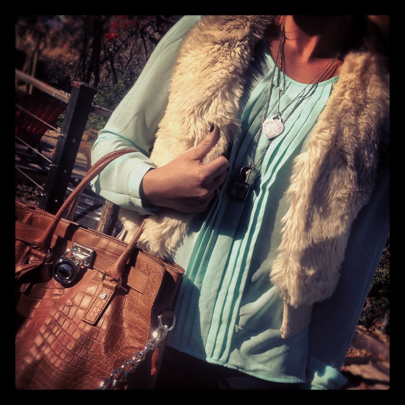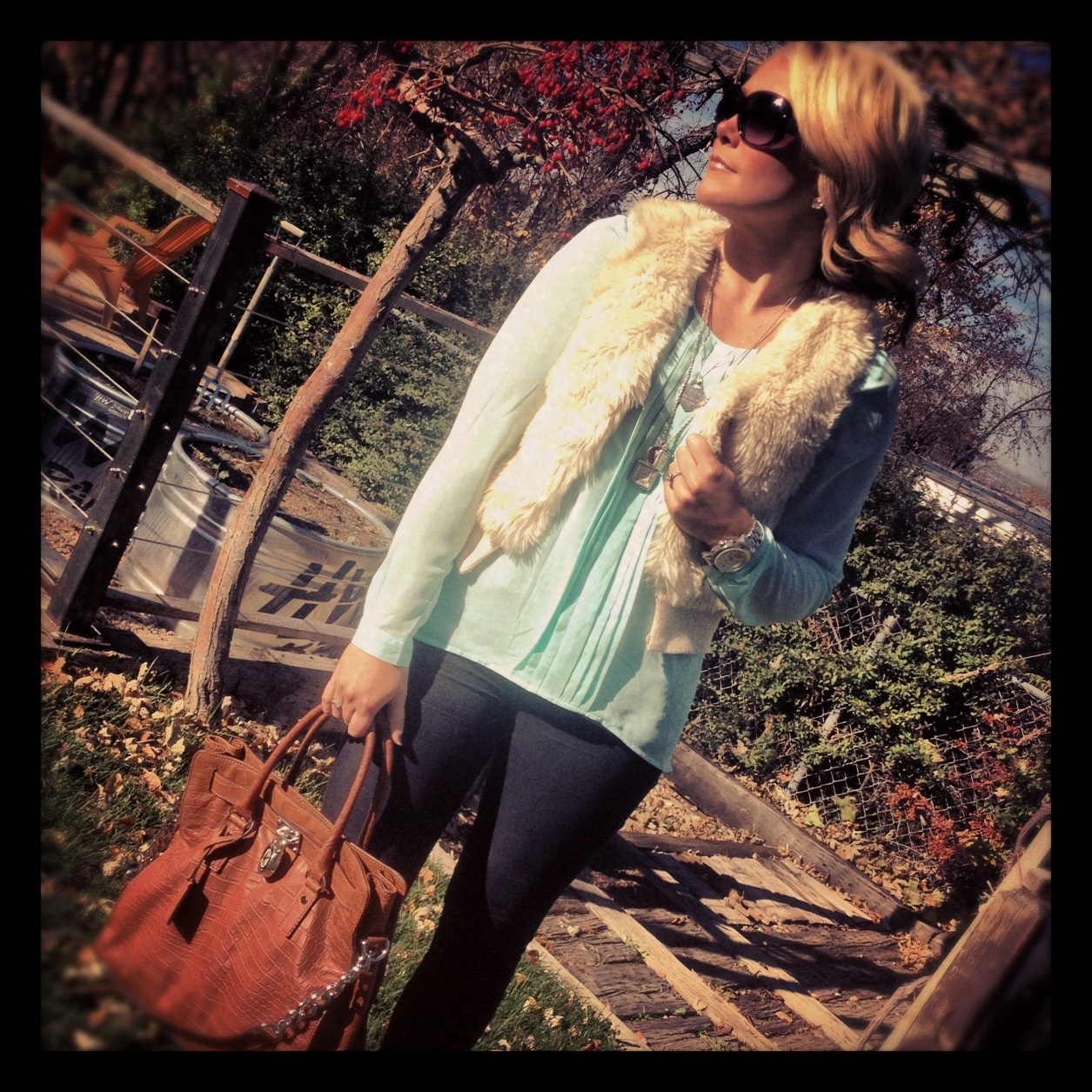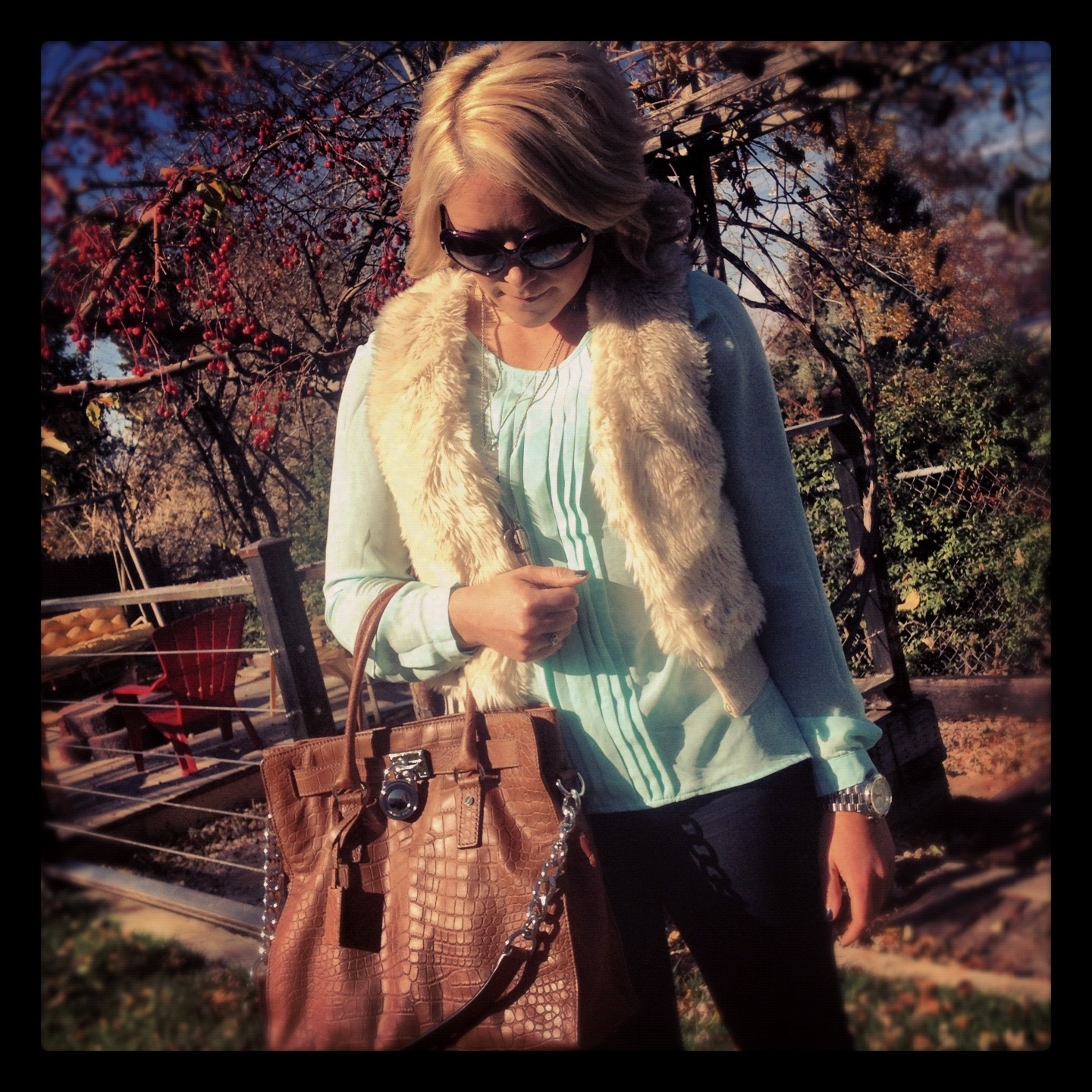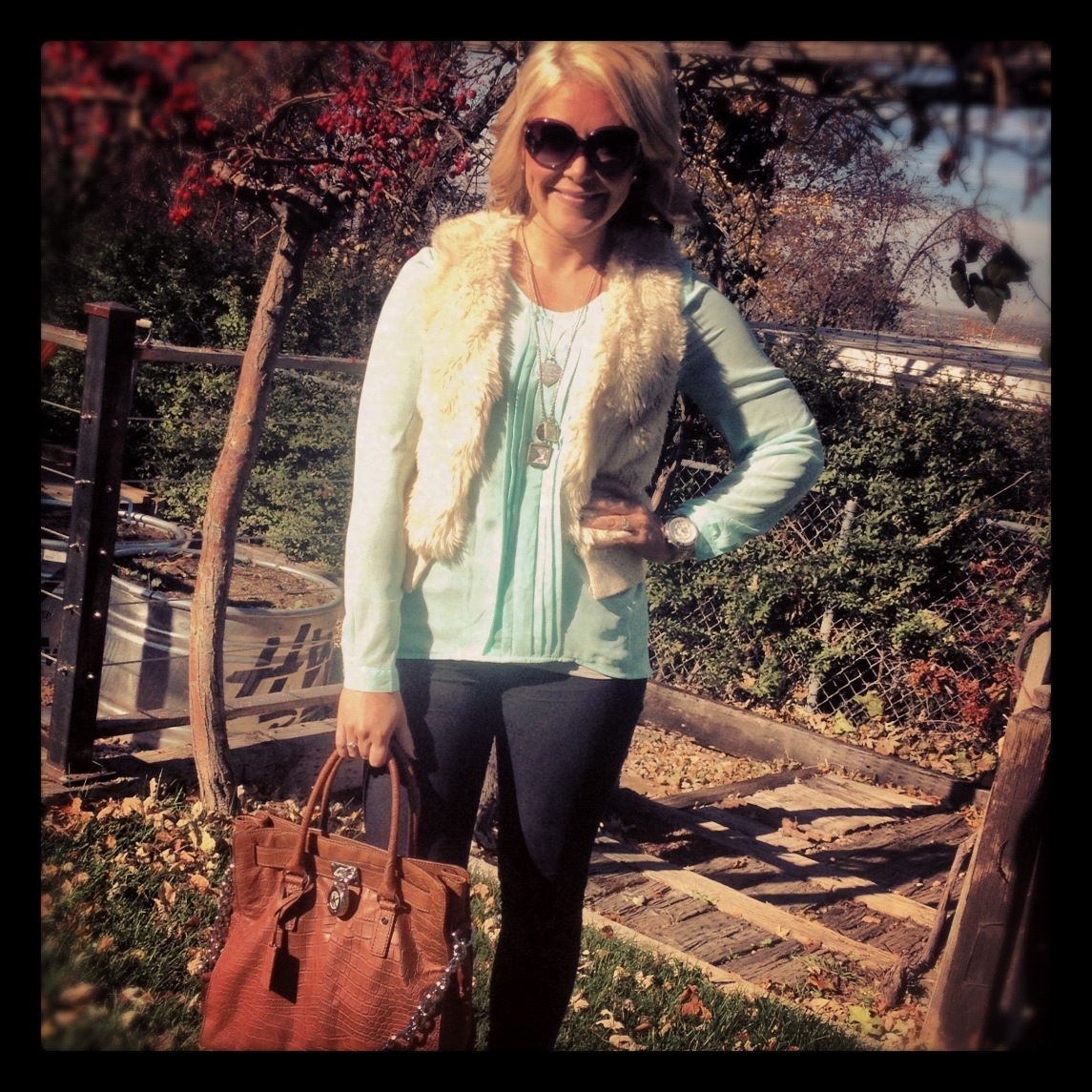 Vest: Macy’s (old), similar, similar | Striped Buttondown: JCrew (old), similar, similar | Skinnies: American Eagle| Monogram Necklace: Keti Sorely Designs | Long Necklace: Stella & Dot | Watch: Michael Kors | Sunnies: Rayban | Bag: Michael Kors Hamilton (on sale!) | Boots: Jessica Simpson (old), obsessed with these