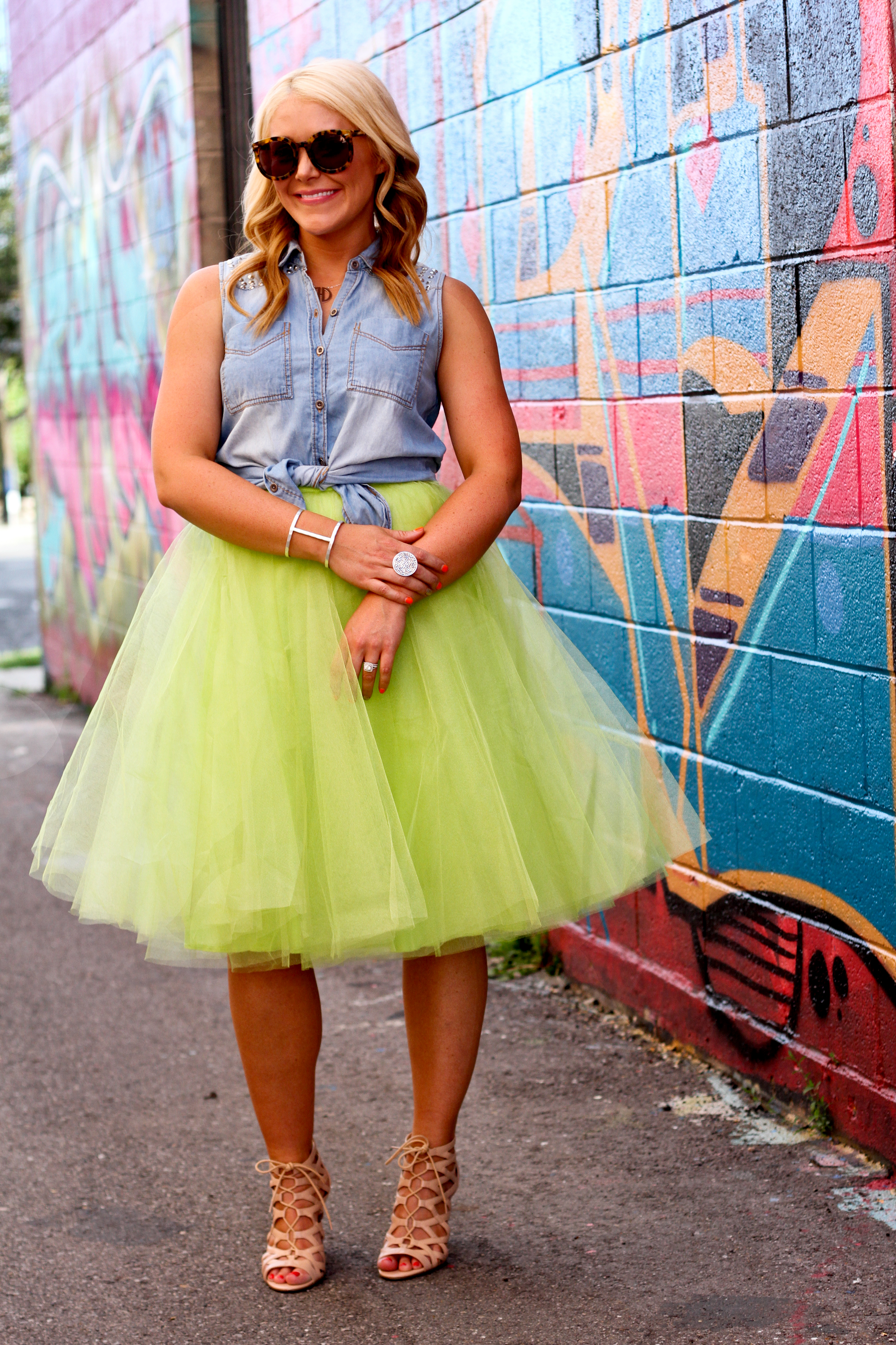 Chambray Top: Kohl’s (old) LOVING this, this, this, and this | Tulle Skirt: The Girl That Loves | Necklace: Etsy, LOVE this one | Cuff: Lucky Brand, similar | Ring: Touchstone Crystal | Sunnies: Karen Walker, under $10 version | Heels: Nine West (super comfy!)
