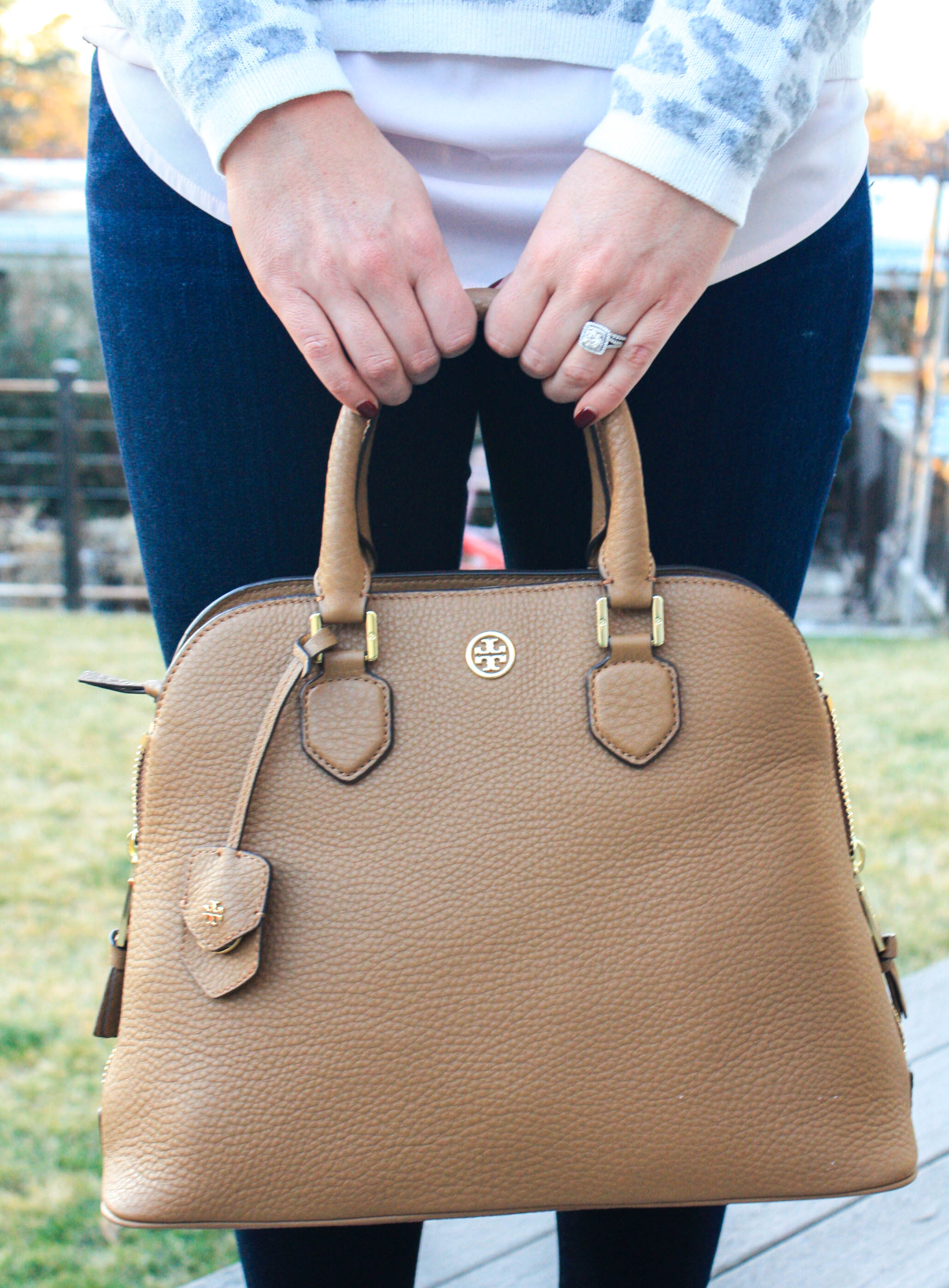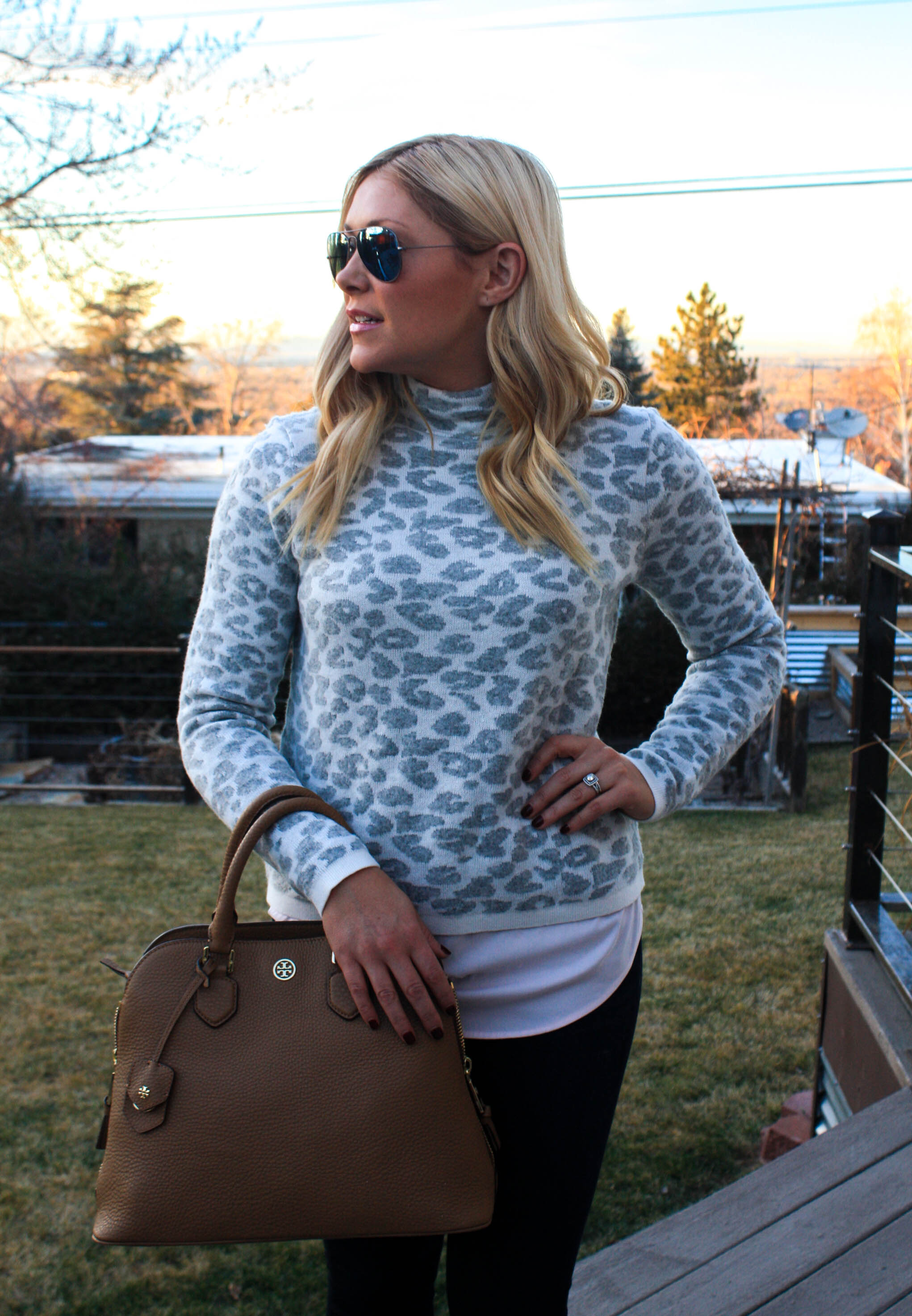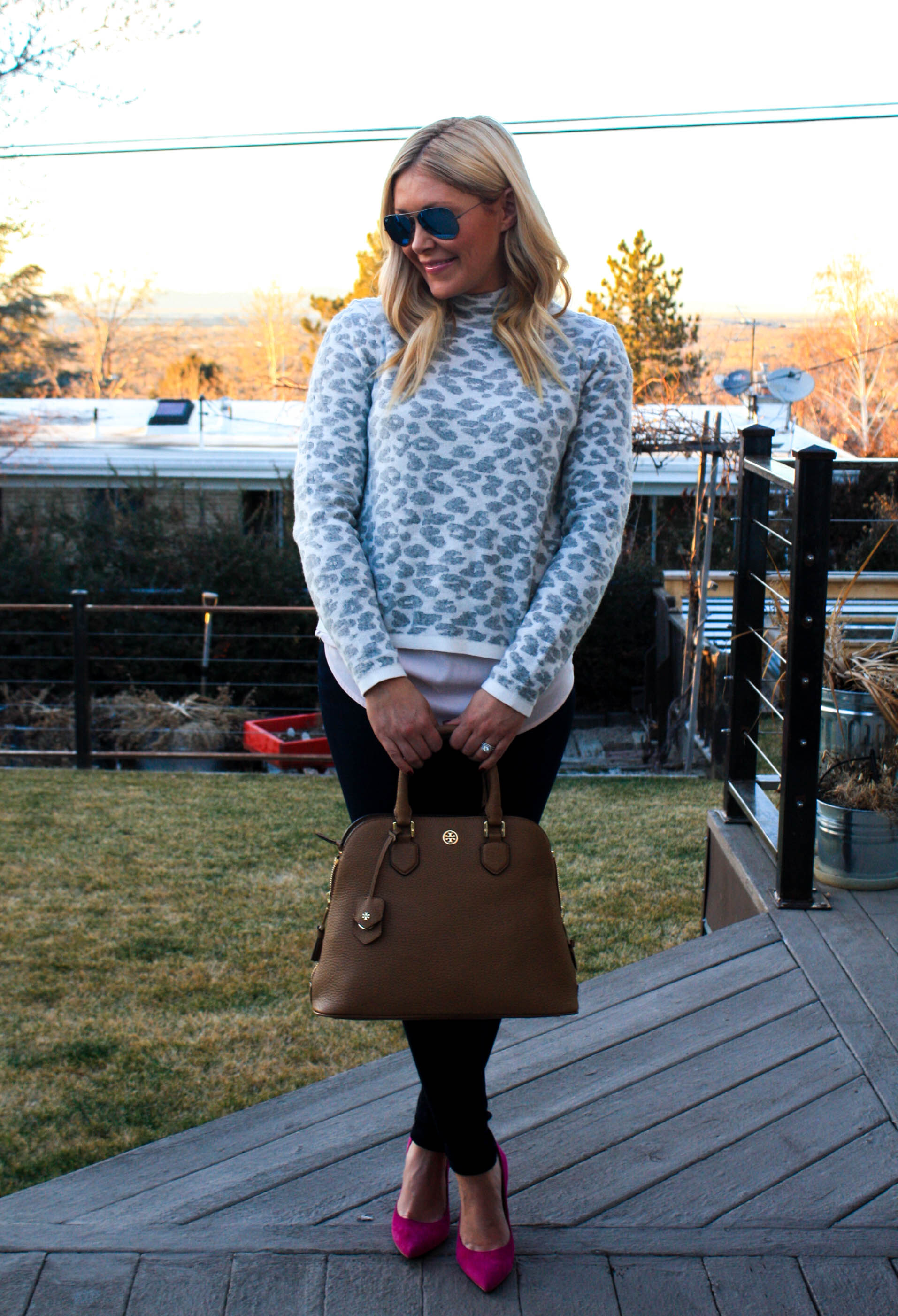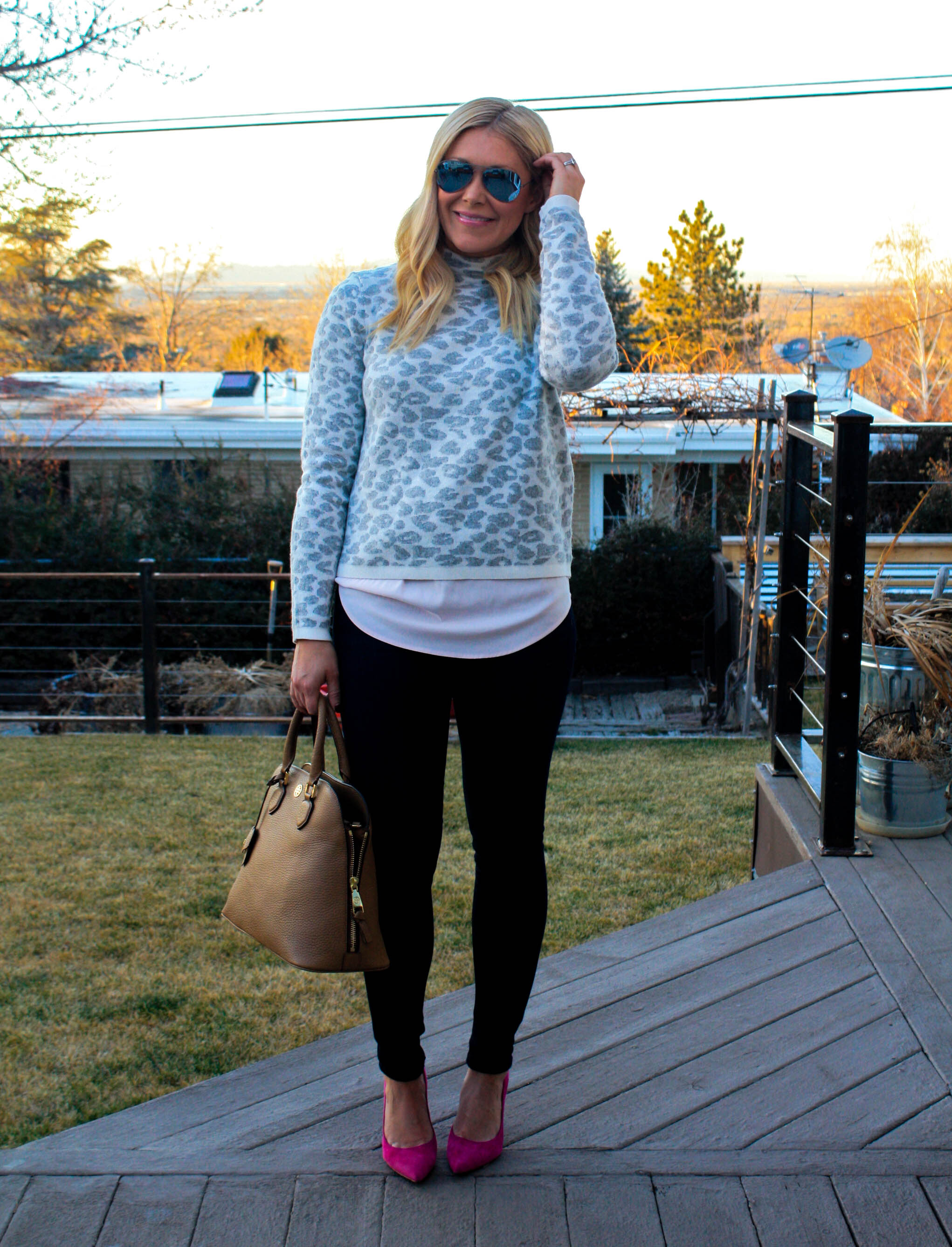 Sweater: Express | Camo Pants: Gap, similar | Necklace: JCrew | Watch: Michael Kors | Bracelets: Stella & Dot Renegade | Ring: Gigglosophy (seriously cute stuff!) | Sunnies: Rayban | Bag: Marc by Marc Jacobs (on sale for 50% off) | Pumps: Nine West