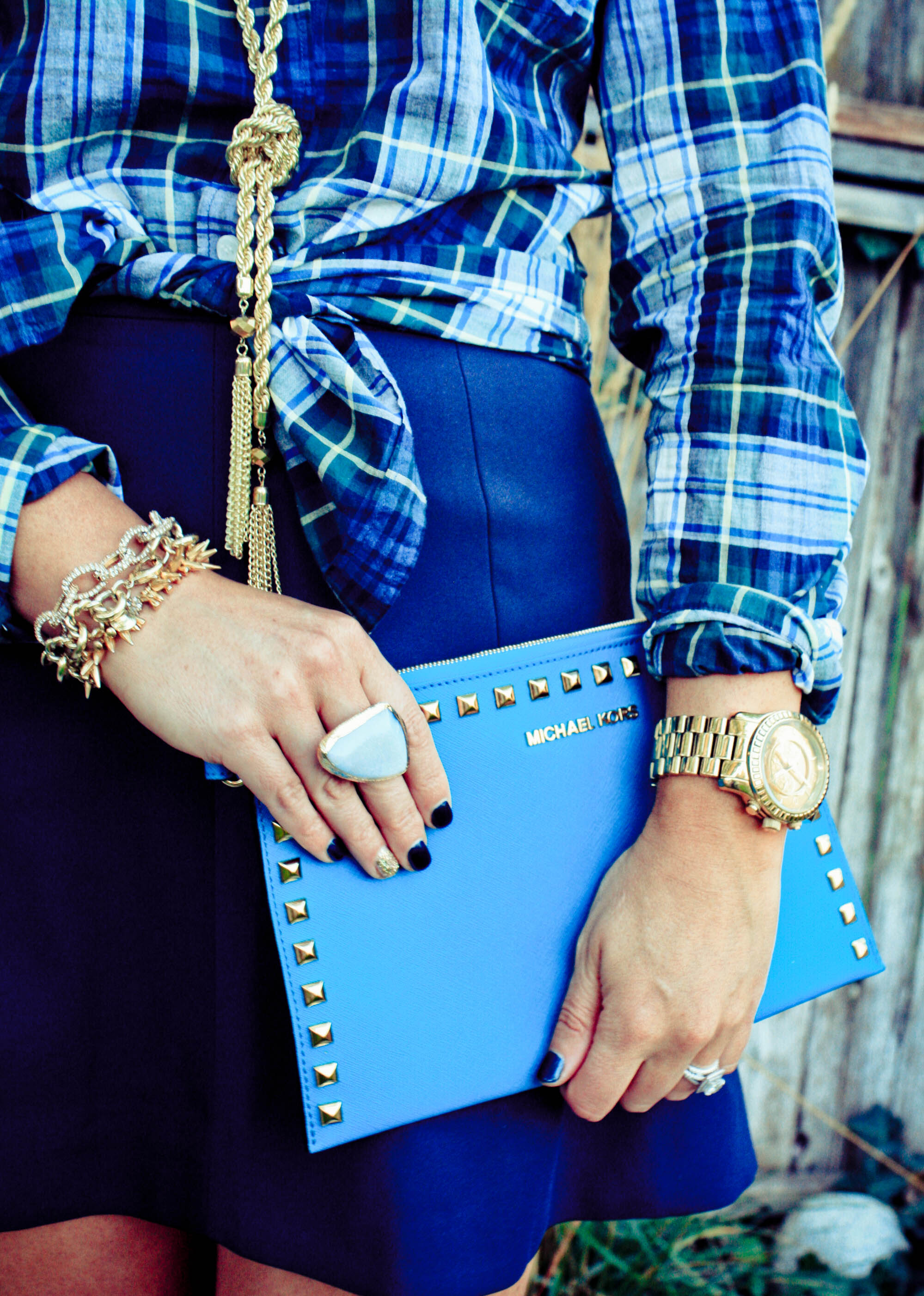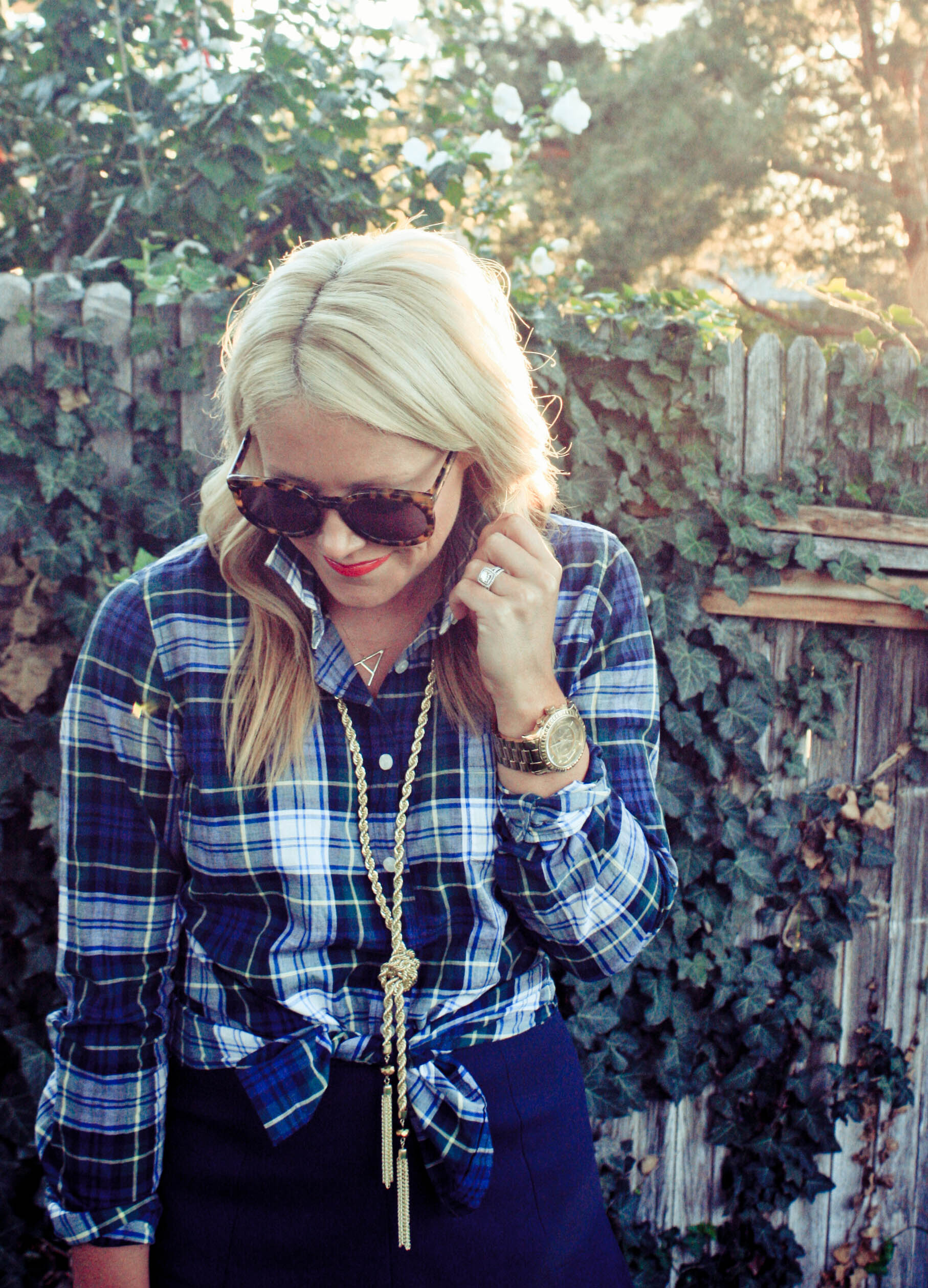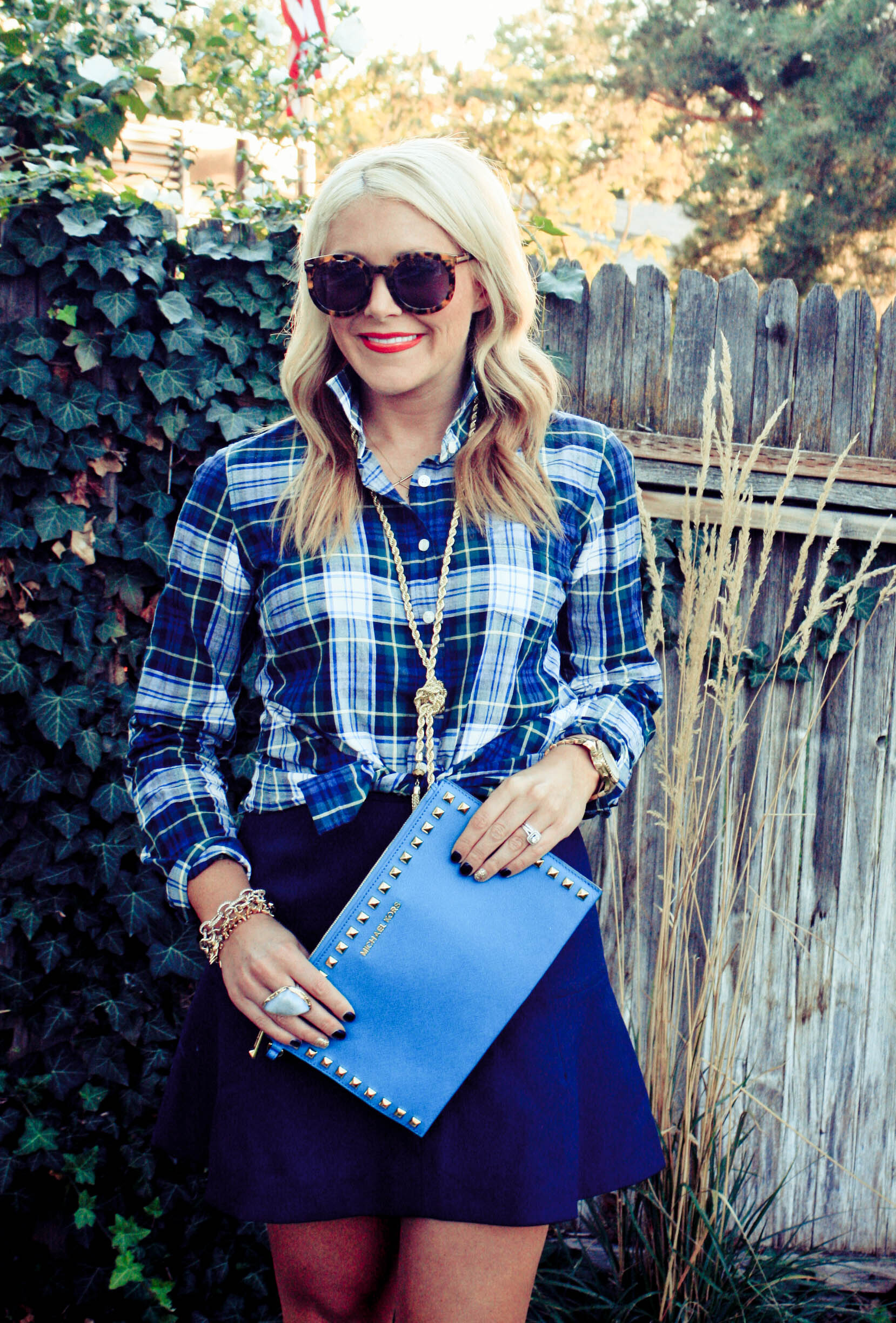 Plaid Shirt: JCrew (last year) very similar, LOVE this and this | Skirt: JCrew (on sale for under $30!), factory version (looks identical and also on sale) | Necklaces: Love Always Couture, Jeweliq (also love this and this) | Bracelets: Stella & Dot (here and here), JCrew | Watch: Michael Kors | Clutch: Michael Kors (sold out), similar, similar | Sunnies: Karen Walker | Pumps: Nordstrom