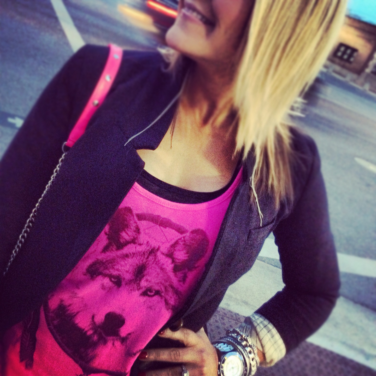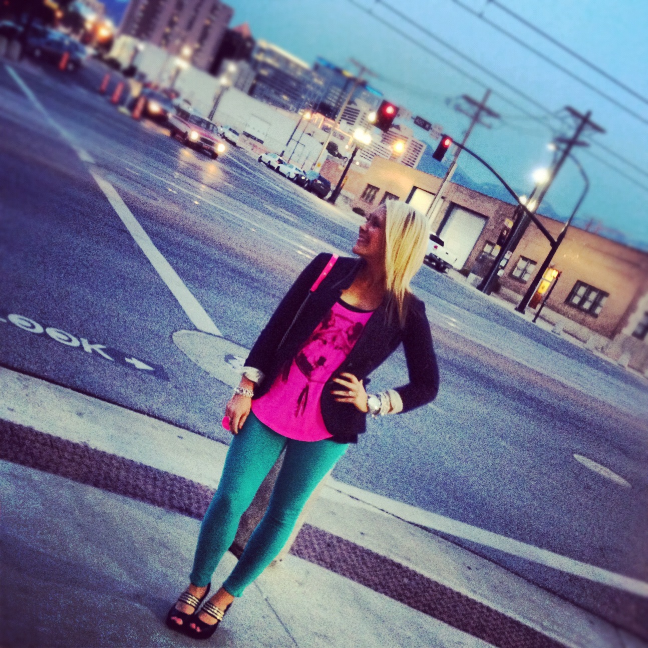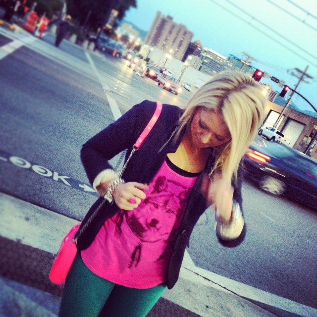 But attending  my first music event of the summer got me thinking.  What is appropriate concert attire?  If they would have been playing an outside venue, the answer would be a lot easier.  I probably would have gone with some sort of maxi dress or cut off shorts and tank-both of which are easy and comfy for an evening outdoors.  But an intimate indoor concert venue?  Well I saw it as an opportunity to wear something really fun that I wouldn’t normally wear on a typical night out on the town.  And that my friends, is my neon pink wolf tank.  Now the Civil Wars are by no means rock and roll, but something about a fun graphic print tee or tank just feels totally right for any kind of music event.  And not only was the wolf tank a winner for the evening, but I paired it back to my bright green jeans, studded shoes, and super long earrings for an outfit that I think was worthy enough for such an incredible show.