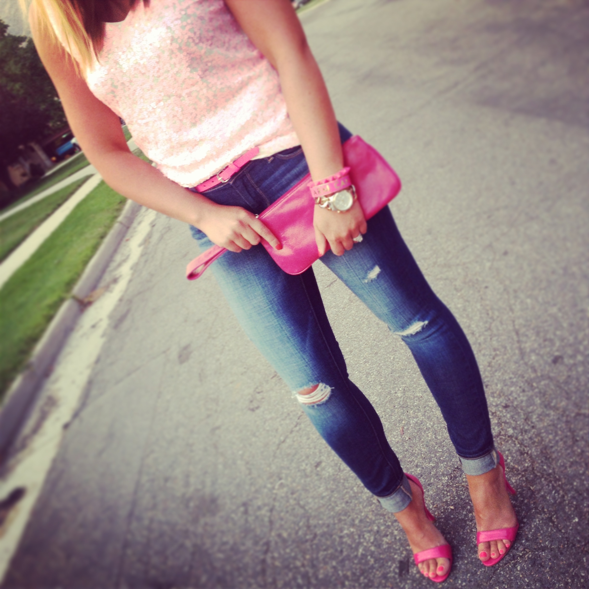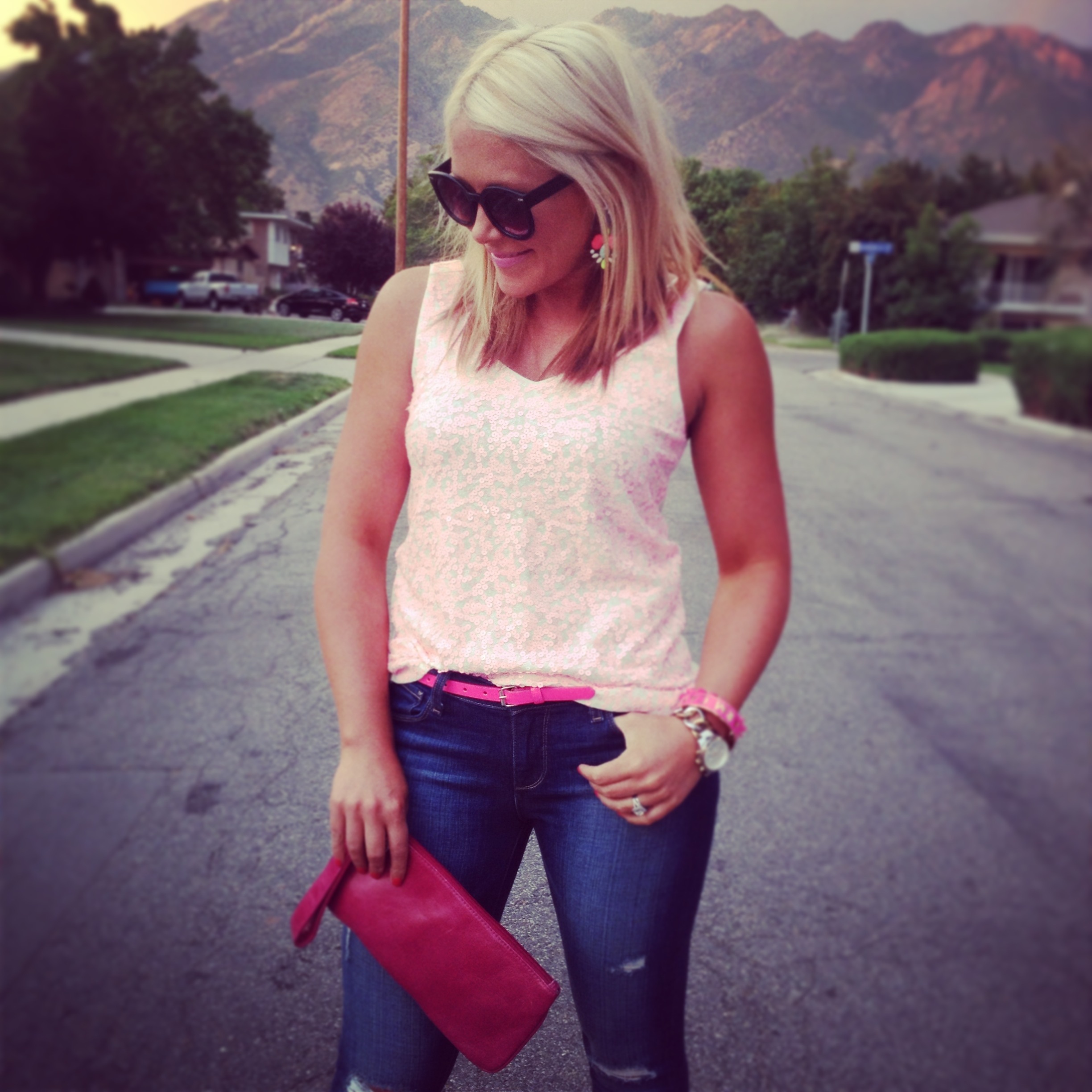 Sequin Tank: JCrew (on sale!) | Jeans: Paige | Belt: Macy’s (old), similar | Bracelets: Kate Spade (old), Aldo (old) | Watch: Michael Kors | Earrings: GroopDealz, similar, similar | Clutch: Hobo International Zoe (old), similar | Sandals: Candies