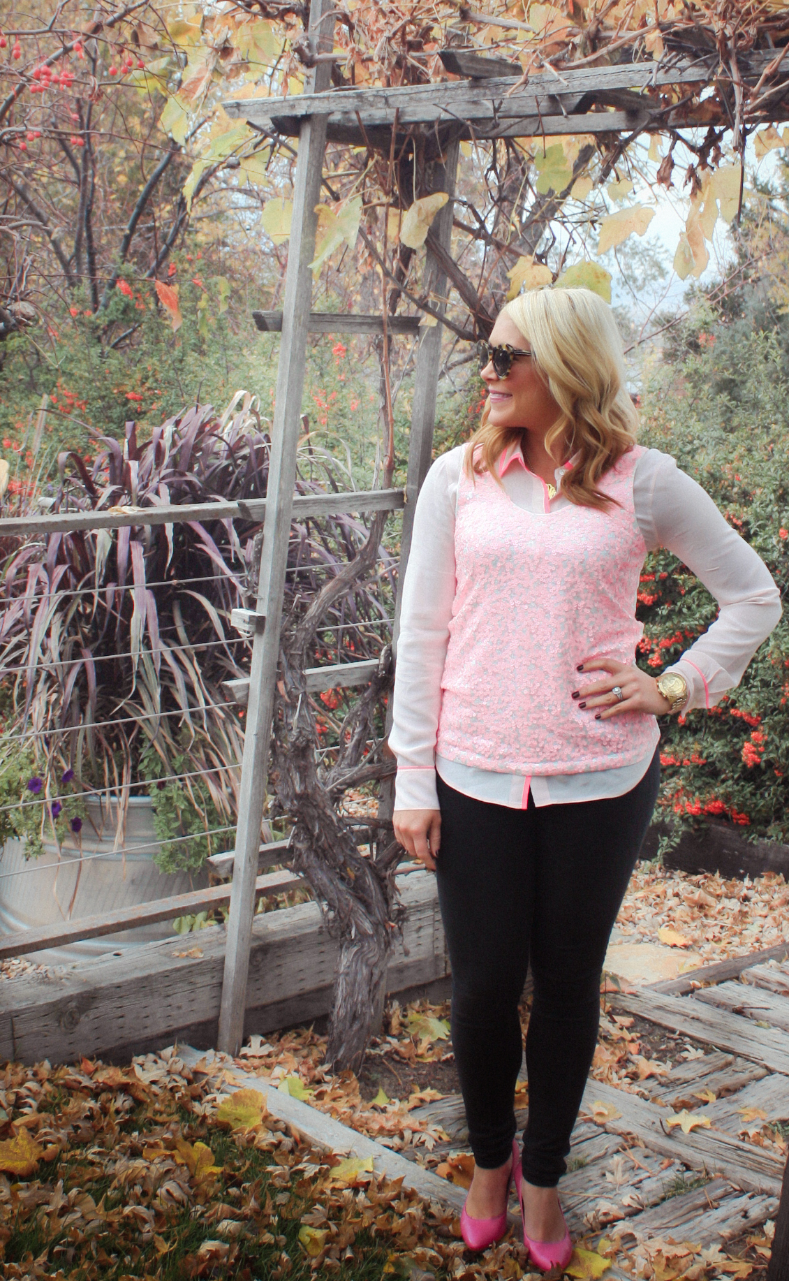 Silk Button Down: JCrew (old), similarsimilar, similar | Sequin Top: JCrew | Skinnies: Else by Joe’s Jeans | Necklace: Keti Sorely Designs | Watch: Michael Kors | Sunnies: Karen Walker | Pumps: INC (old), similar