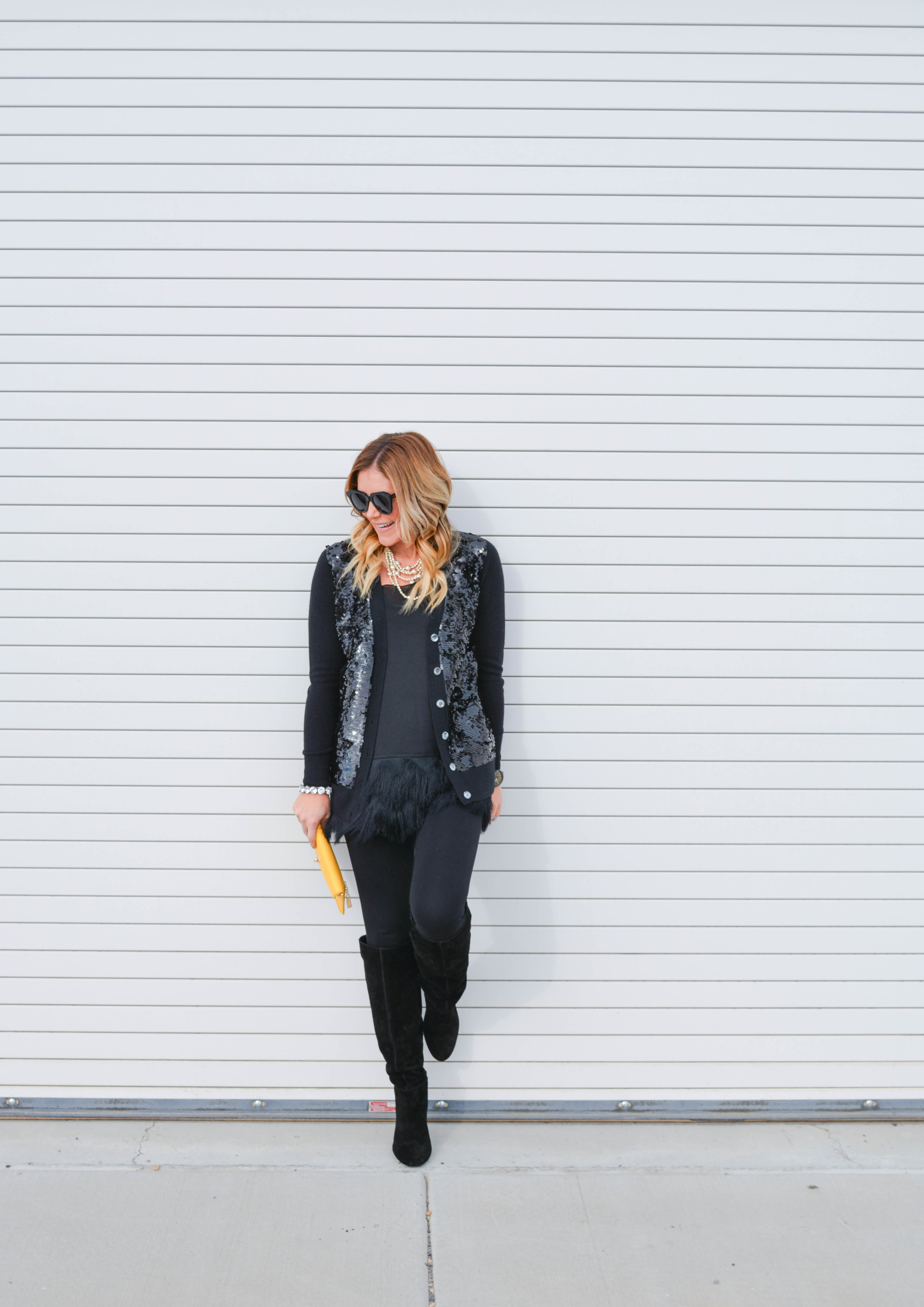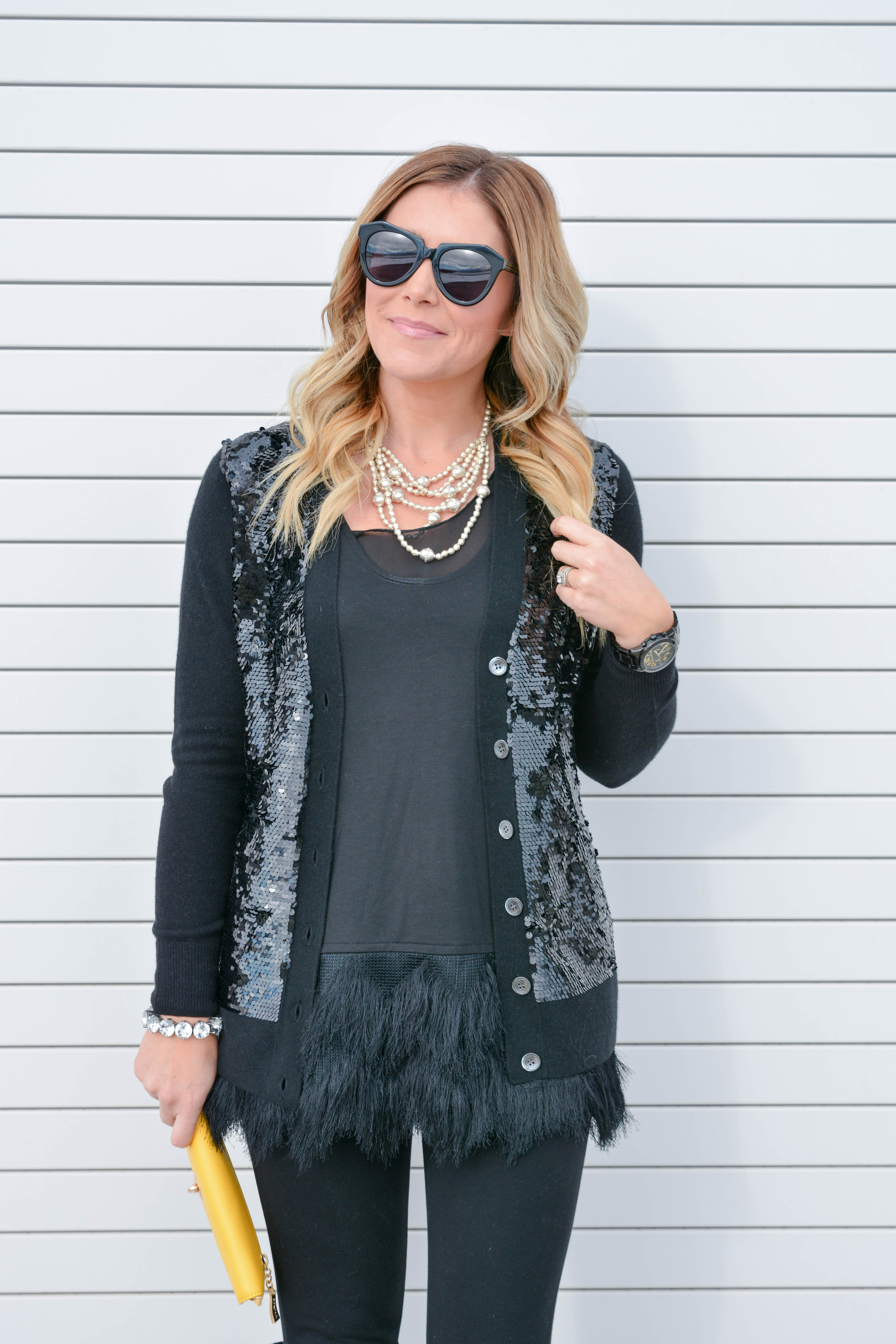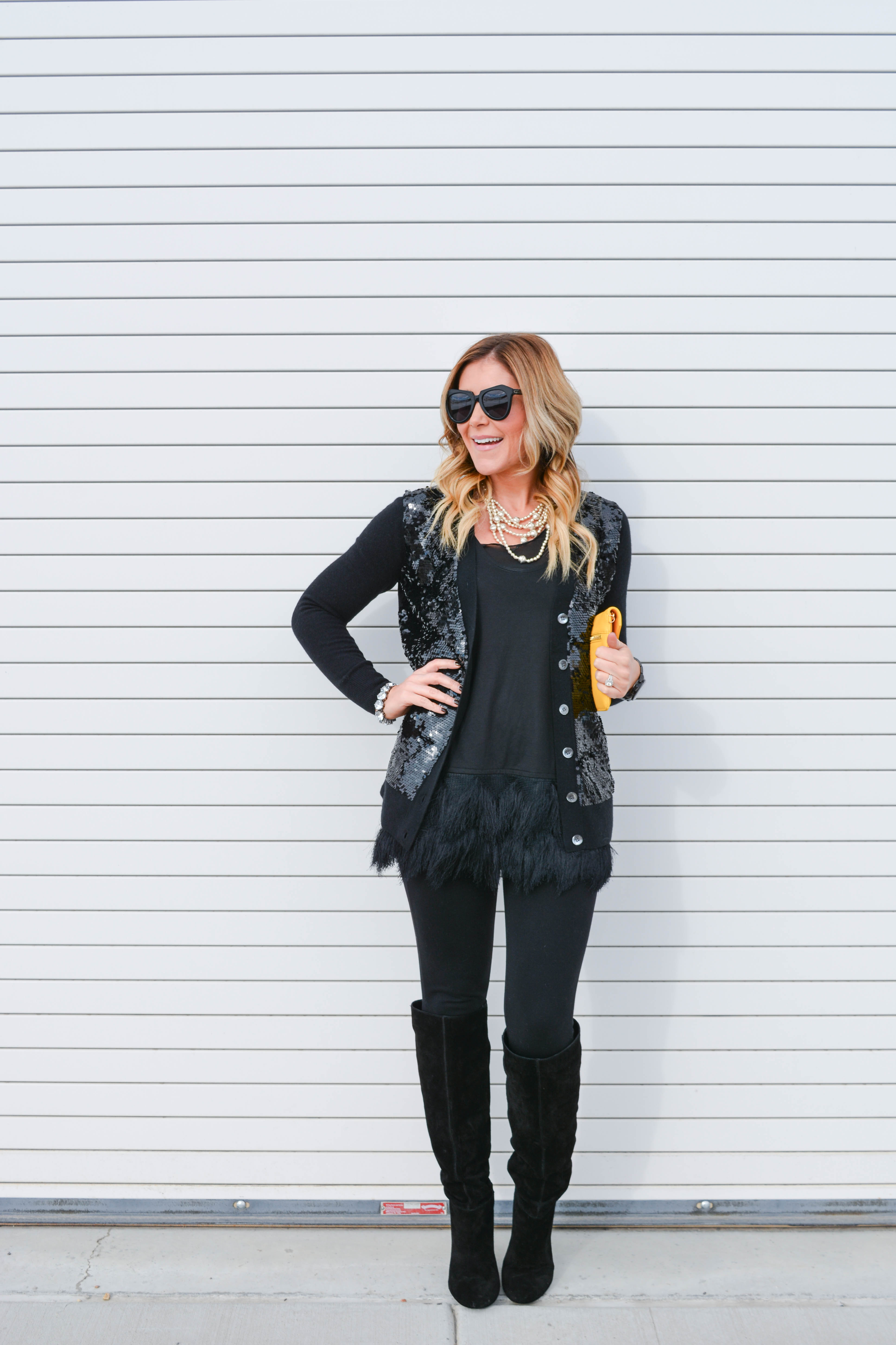 DSC_3066 DSC_3070 DSC_3094 DSC_3060 DSC_3088 DSC_3090 DSC_3102 DSC_3072 DSC_3132 DSC_3139Feather Top: Banana Republic (on sale!) | Sequin Cardi: JCrew (also comes in blush and is on sale!) | Skinnies: JCrew (my faves!) | Necklace: Raven + Lily | Clutch: Sorial (comes in lots of colors!) | Sunnies: Karen Walker c/o Ditto | Boots: Jessica Simpson