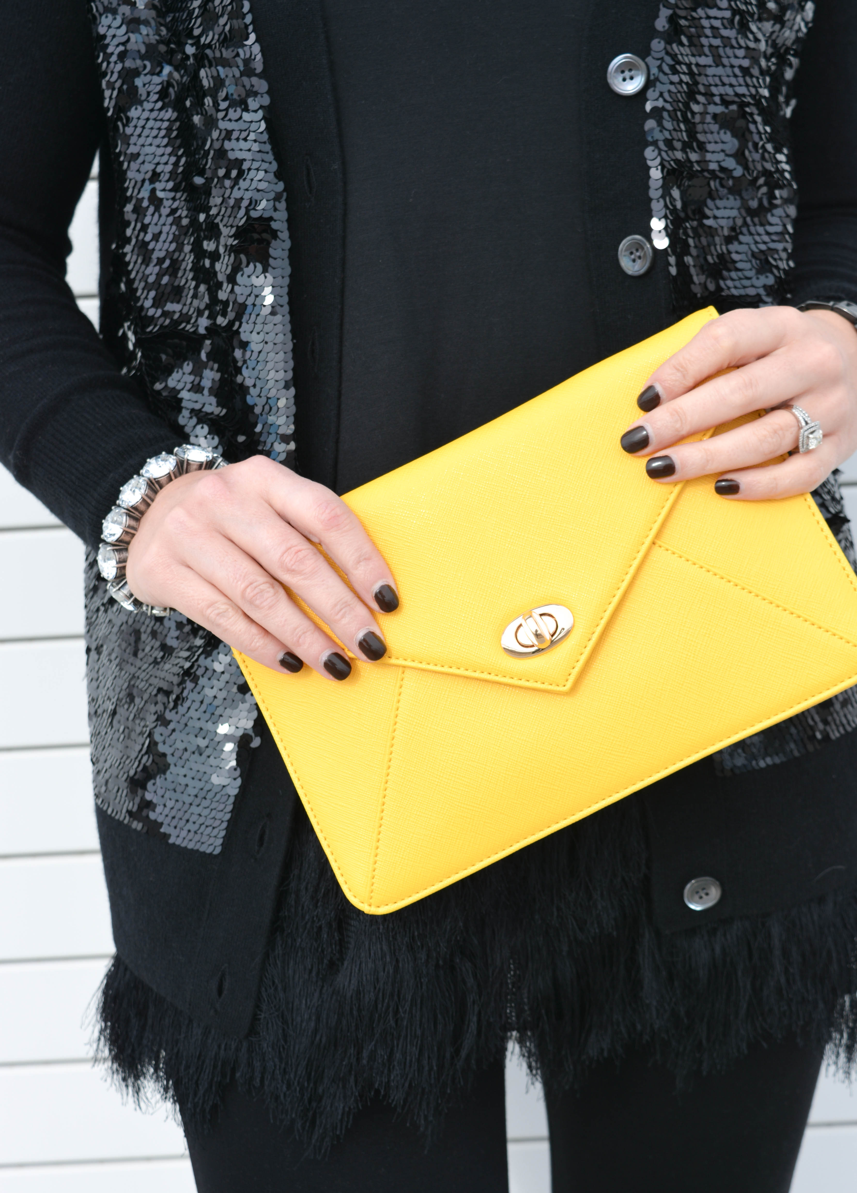 My mom has always had great taste.  And even as an adult, I always anxiously anticipate the fun gifts she will spoil me with on special occasions.  And this yellow clutch, along with my necklace, are not only two of my very favorite Christmas gifts (courtesy of my sweet mom), but they are both staples that will remain relevant in my wardrobe for a long time to come.  Plus, who says you can’t wear sequins and feathers after the holidays?