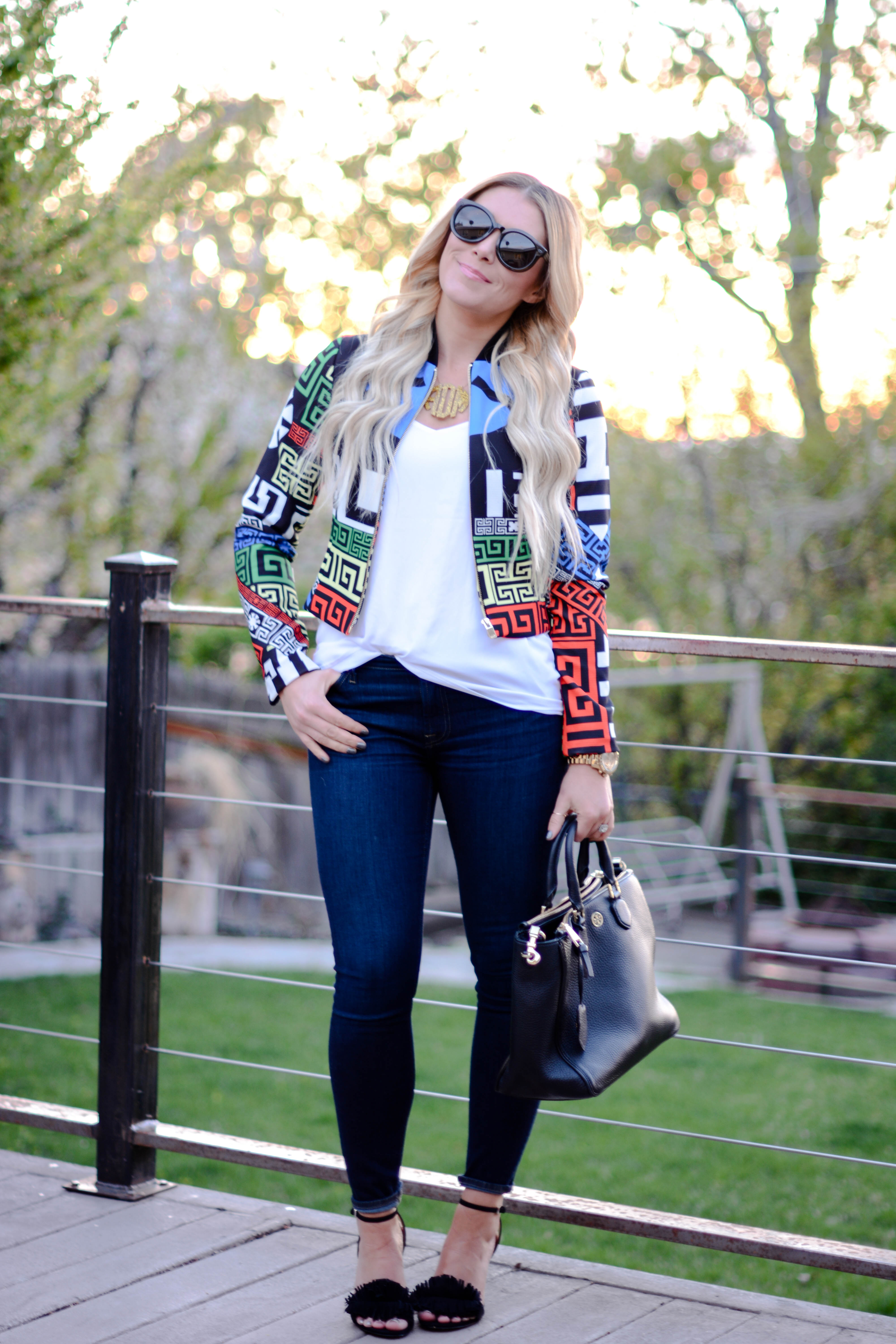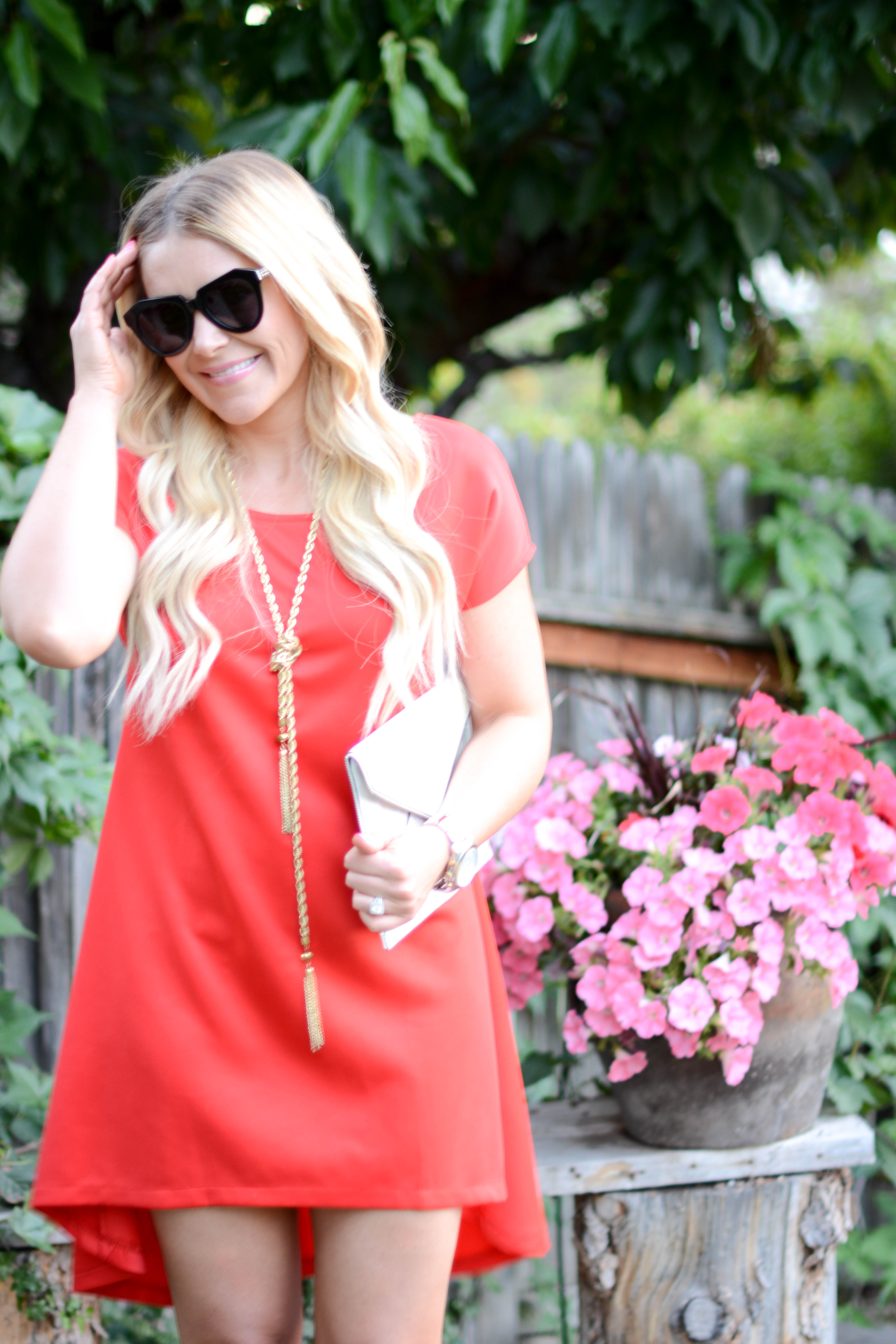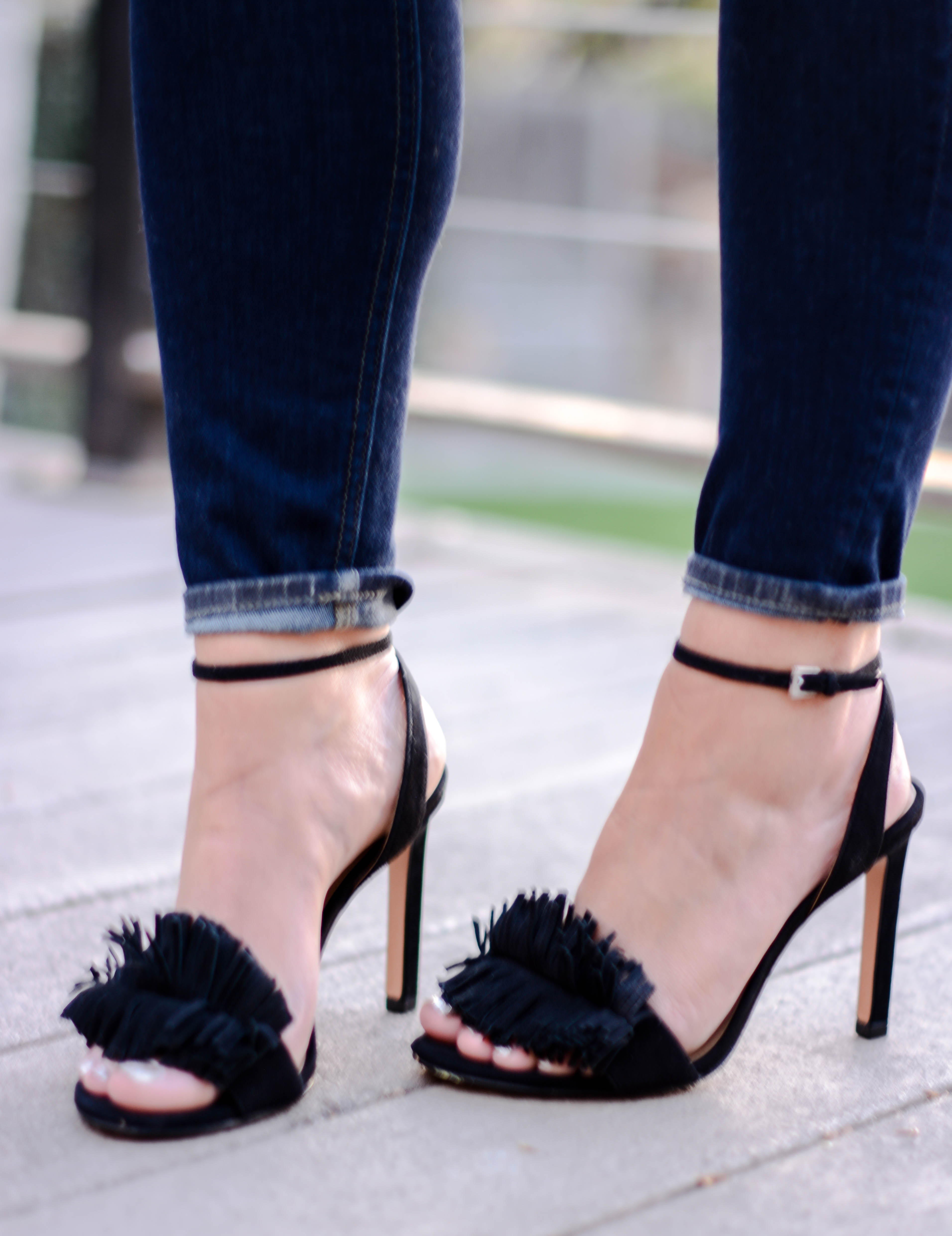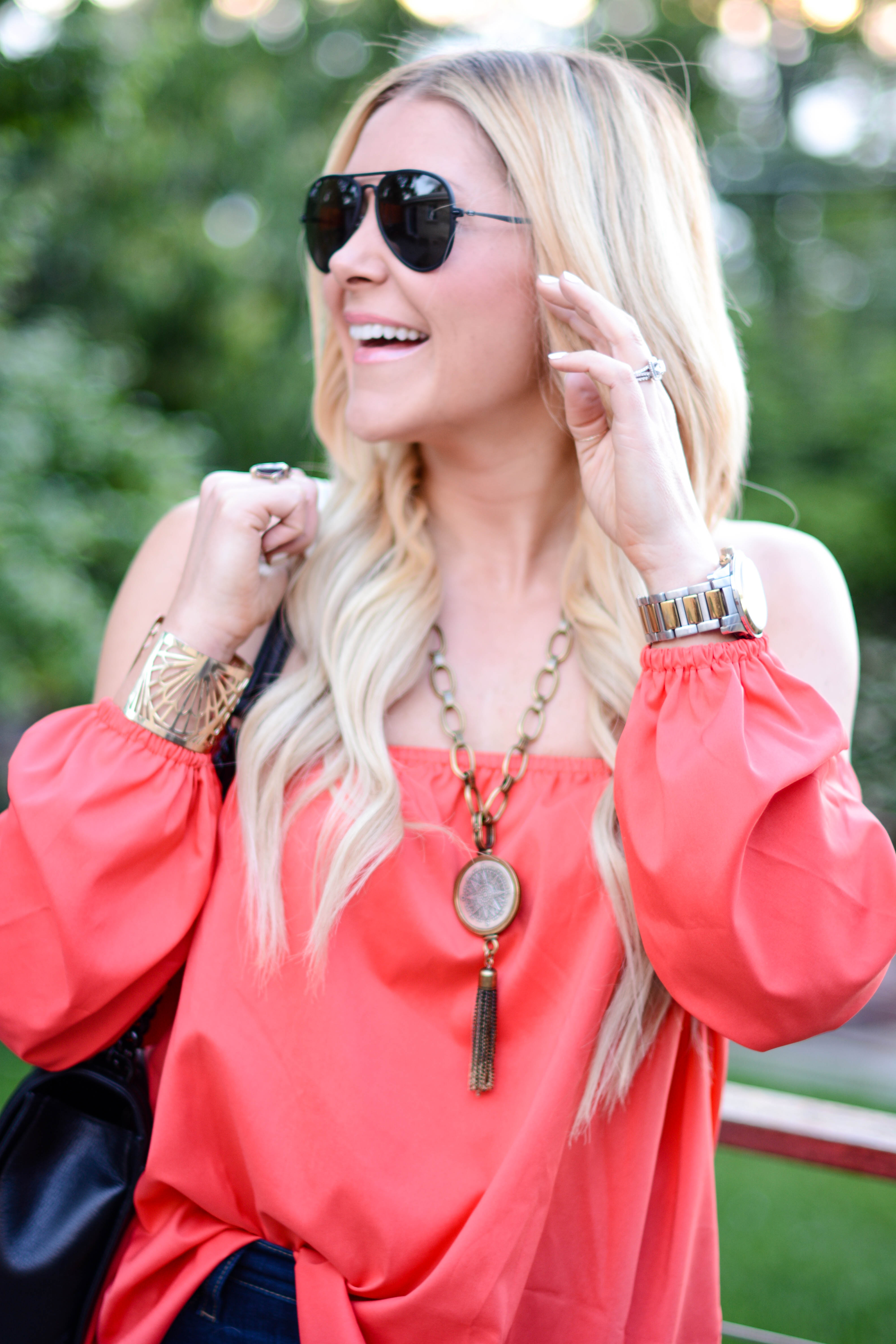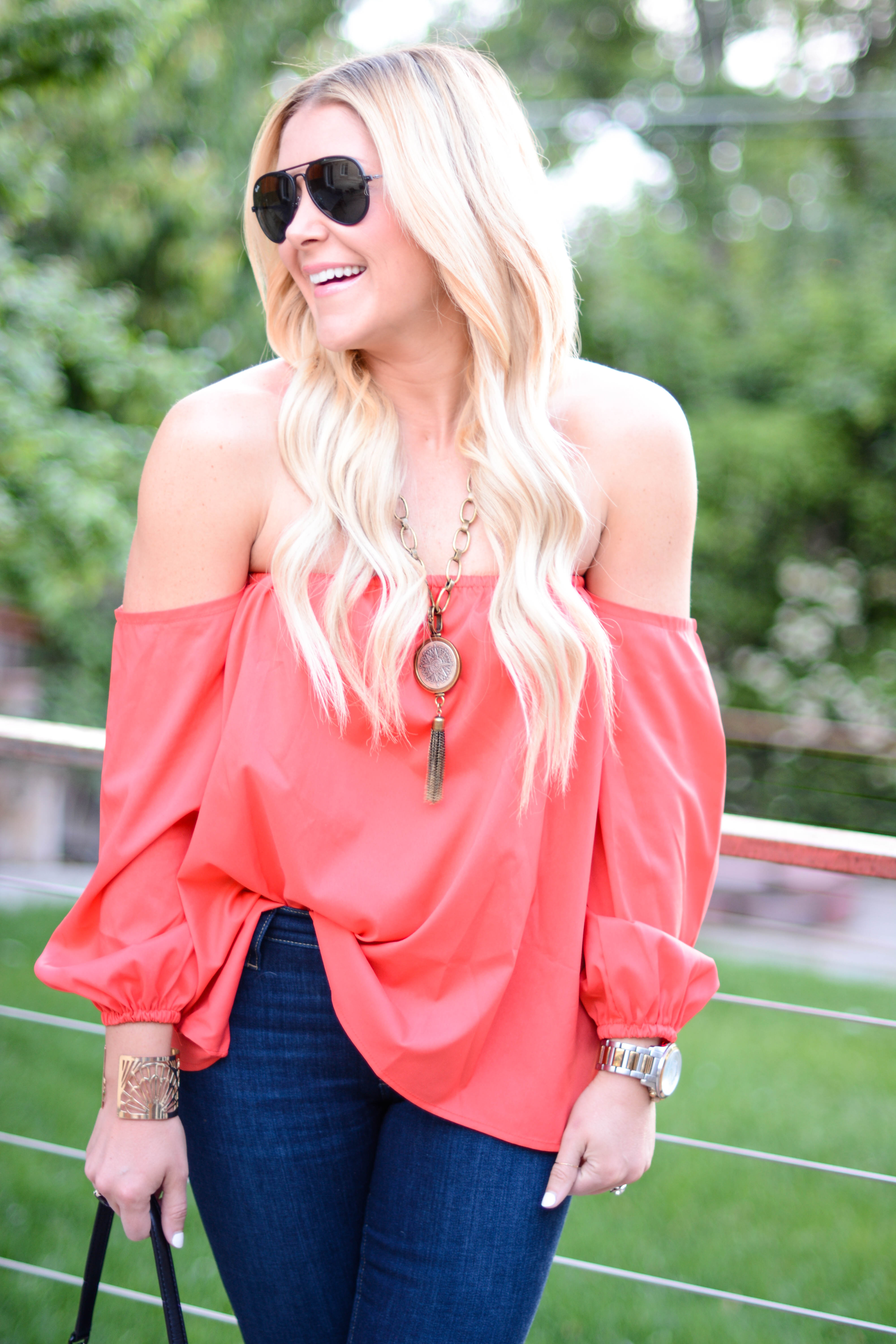 I am wearing four of my favorite trends for Spring and Summer in today’s outfit post: destroyed denim, an off-the-shoulder top, platform sandals, and round sunglasses. And while I’ve been playing around with the first three trends for quite some time now, I just recently purchased my first pair of round sunglasses. And I have so say, I am LOVING them. In fact, I just ordered a second pair with a gradient lens, as opposed to mirrored and I can’t for them to get here. I’d also love to know, what are some of your favorite trends for this season?