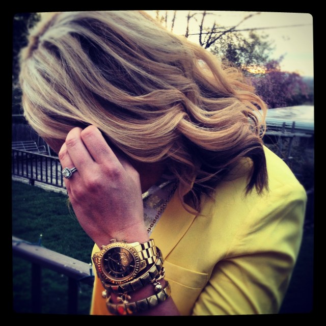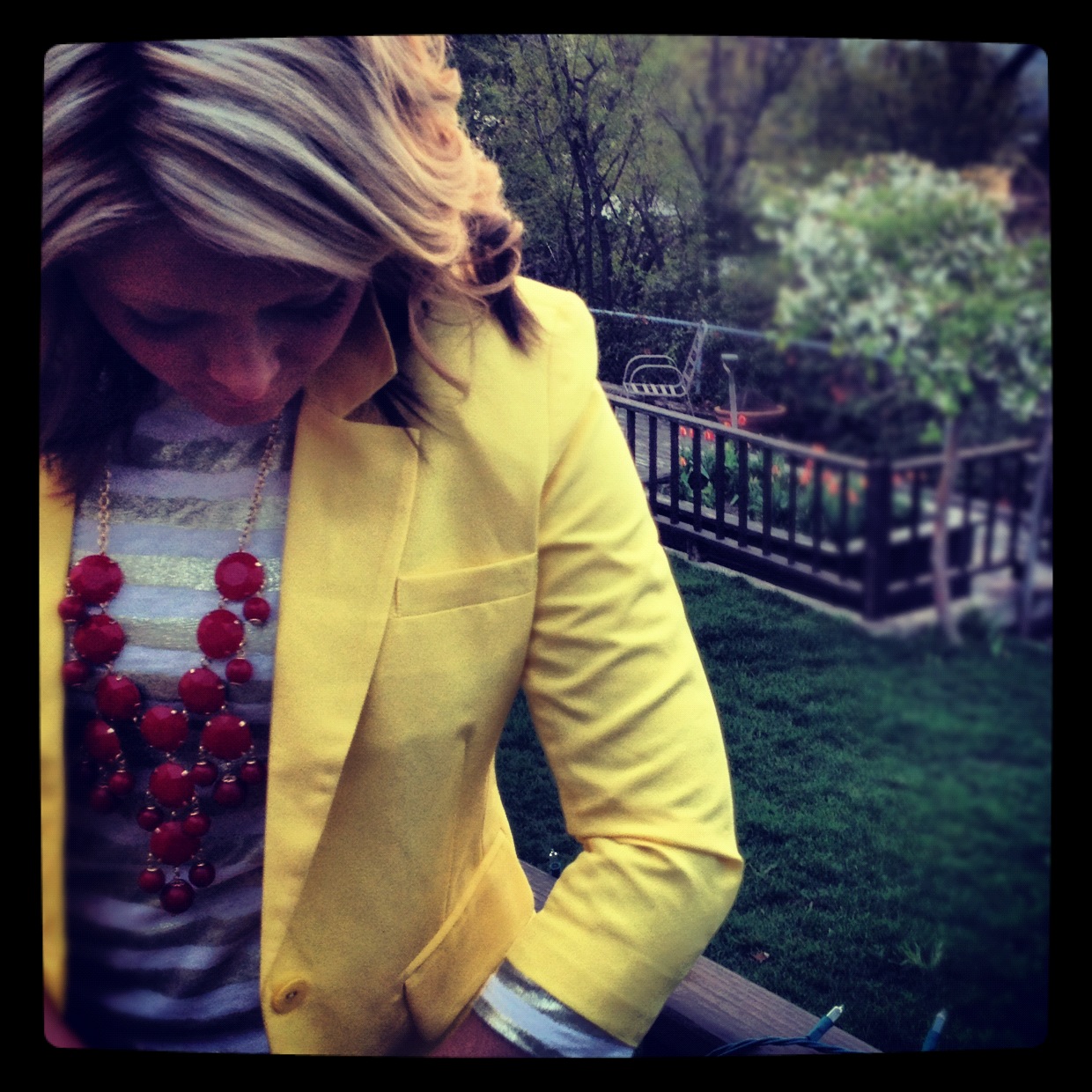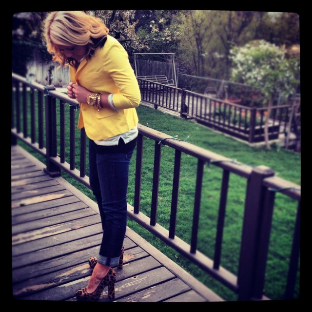 So when my best gal pals were visiting a couple of weeks ago and I picked up a fun new yellow blazer on our marathon shopping spree, I knew immediately it would look amazing with a pair of boyfriend jeans and (of course) sky-high leopard heels. And one thing you will find if you follow this blog, or look at my Pinterest boards, is that I am a sucker for the mix of a beat up baggy jean with a more sophisticated heel and blazer. In fact, when you combine all of these things together, there are a very wide breadth of occasions where an outfit like this would be appropriate: brunch, errands, lunch date, a movie, or even a casual dinner with the hubby or friends. Spunky, yet casual and sophisticated-definitely right up my alley. 🙂