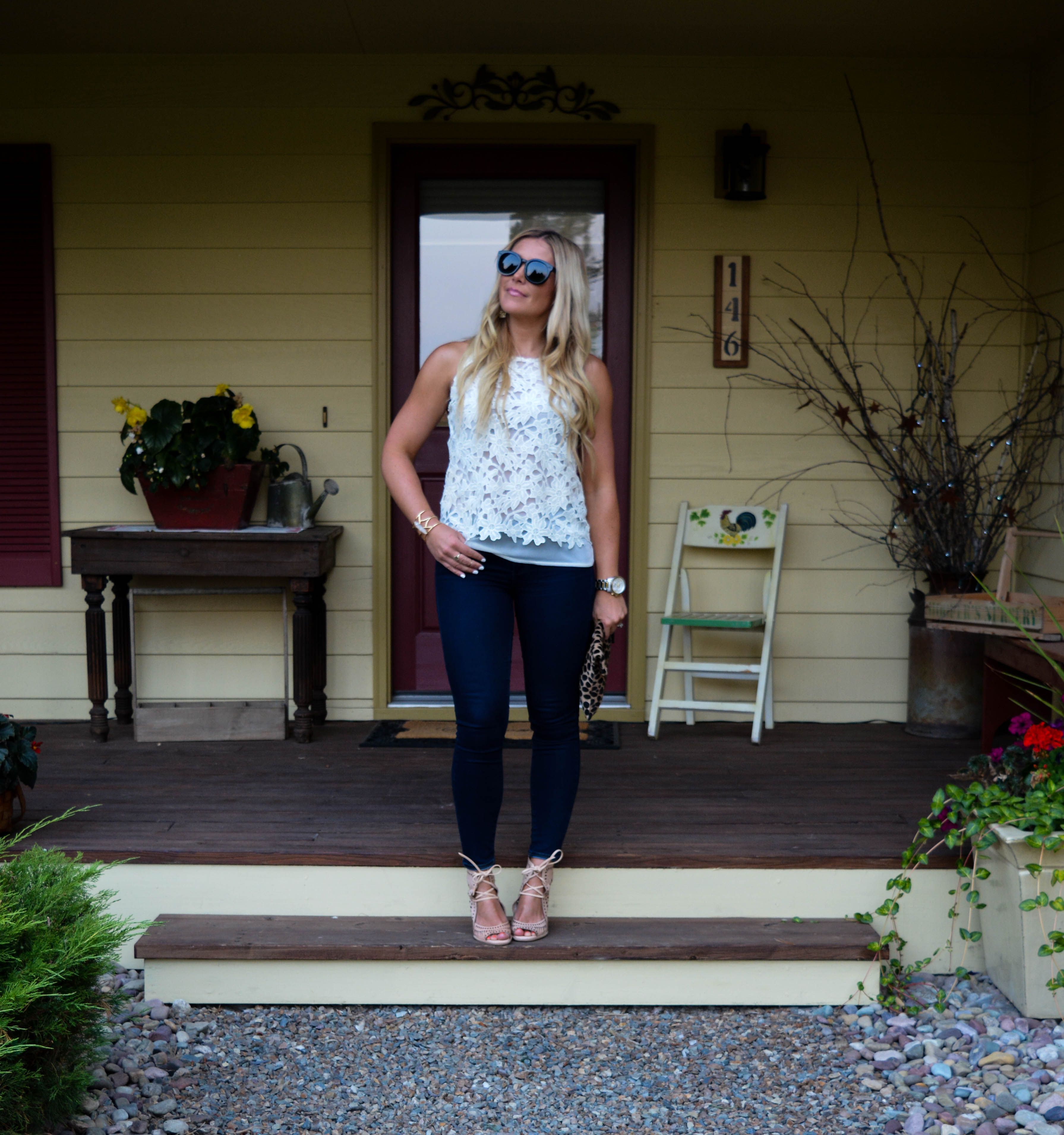Believe it or not, sometimes I have no idea what to wear. Honestly,  I think we all have those days where we just stand in our closets completely blank, not really knowing where to start.  So when I find myself having one of those moments, I’ve found that sometimes the best solution is to go back to basics and go with what I “know”.  For me, that is a simple top (usually a tank), a favorite pair of jeans, and a pair of pumps.  It’s an outfit I always feel good in and it’s typically appropriate for any occasion.  Plus, it’s a great blank canvas to change-up with a fun necklace, statement pumps, or other great accessories!