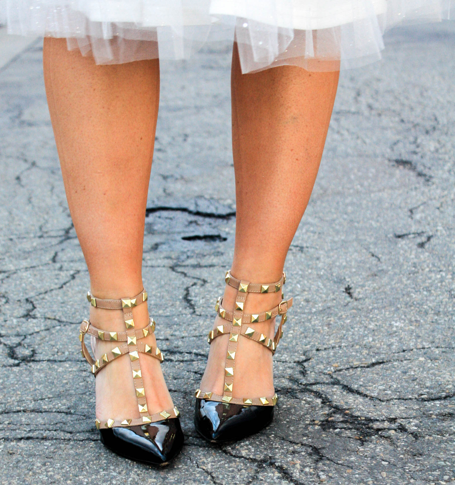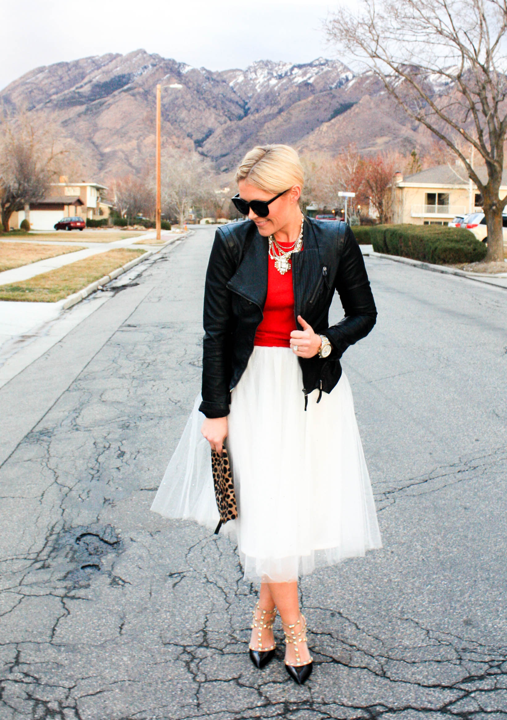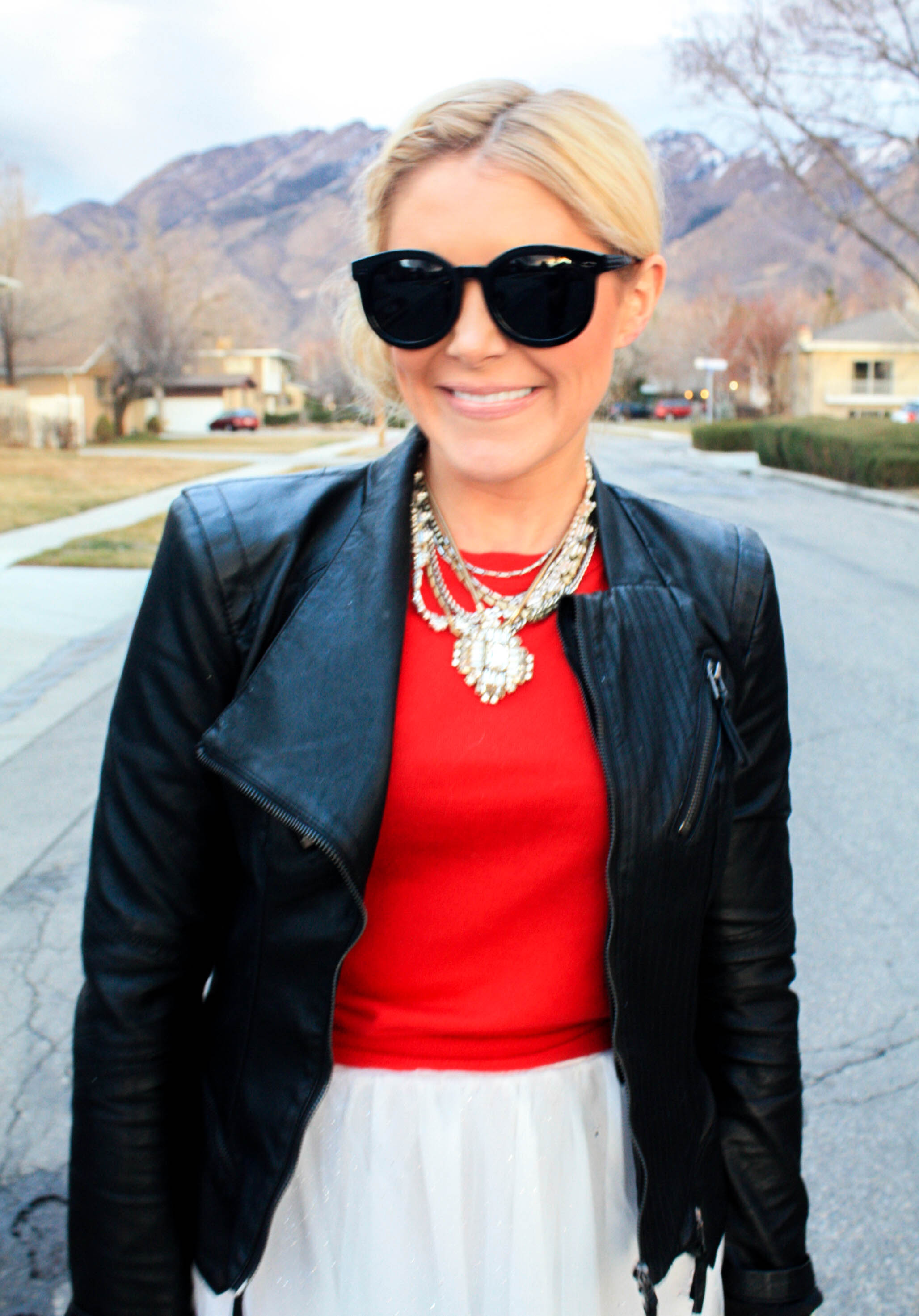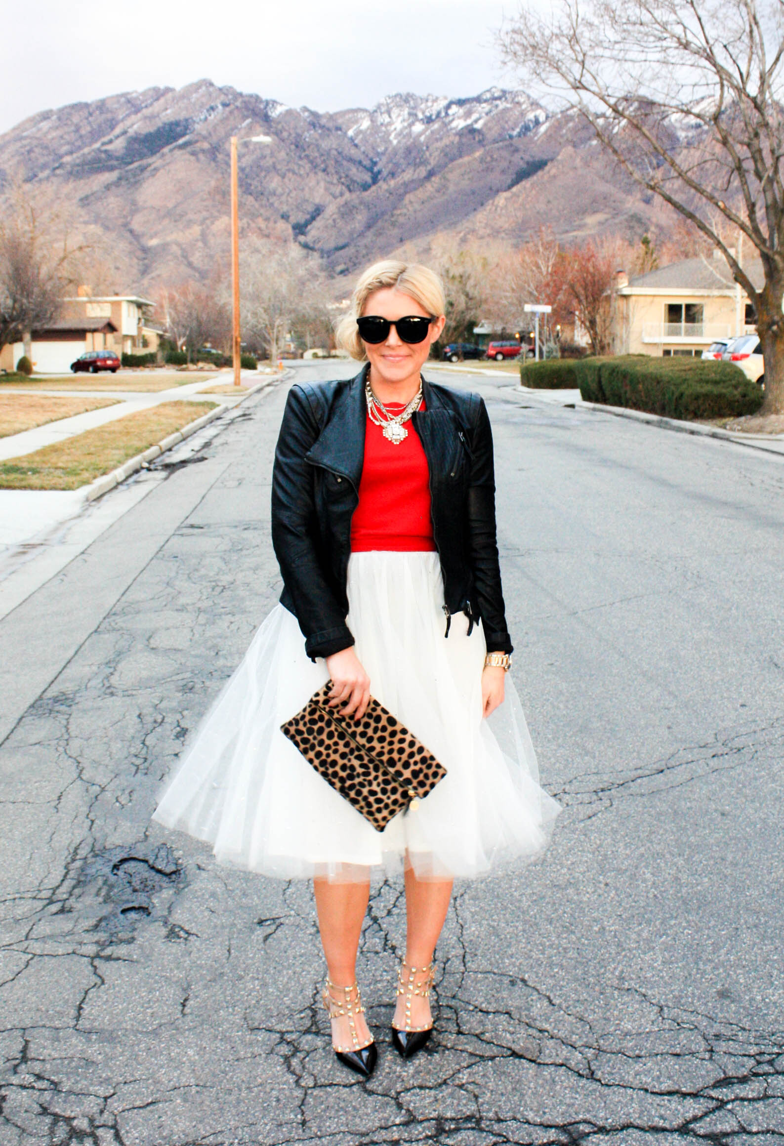 Tulle Skirt: Dainty Jewels c/o also love this, this, and this| Top: Express (LOVE this top-I wear it so much AND it’s on sale!) | Necklaces: JCrew (here) | Bracelets: JCrew (here and here) | Sunnies: Karen Walker | Clutch: Clare Vivier | Pumps: Sam Edelman LOVE this sequin version