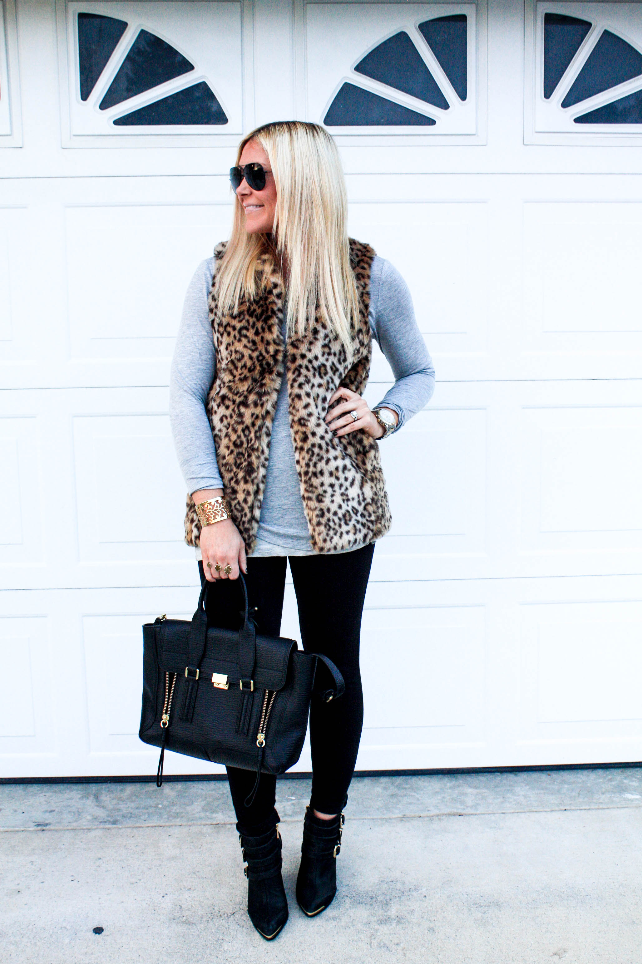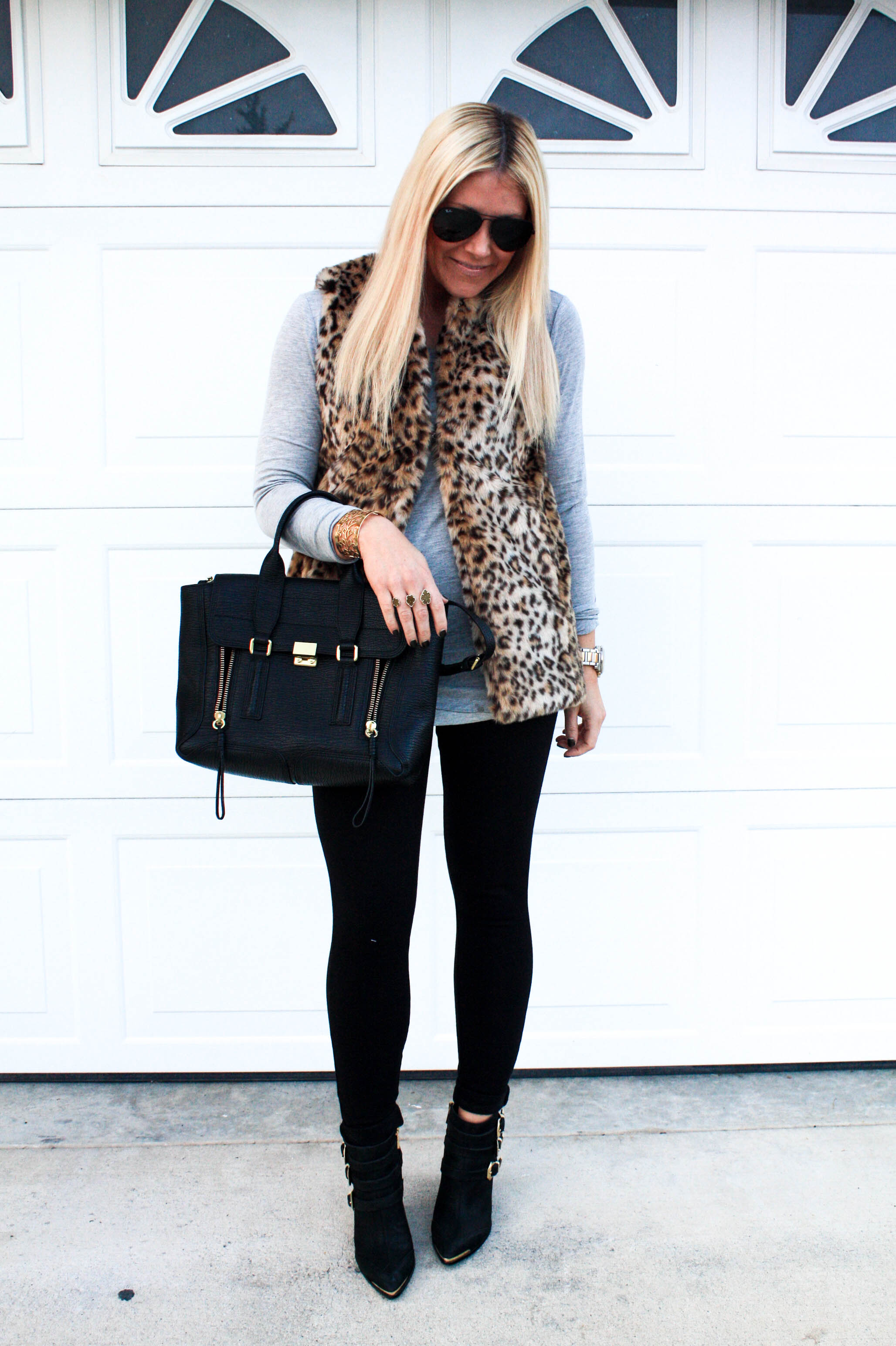 Leopard Vest: Forever21 (sold out online, but check in store!), similar, similar, similar, similar | T-Shirt: H&M (check in store), similar, similar | Skinnies: 7 for all mankind | Cuff: Macy’s | Ring: Kendra Scott | Watch: Michael Kors | Sunnies: Ray-ban | Bag: 3.1 Phillip Lim | Booties: Vince Camuto