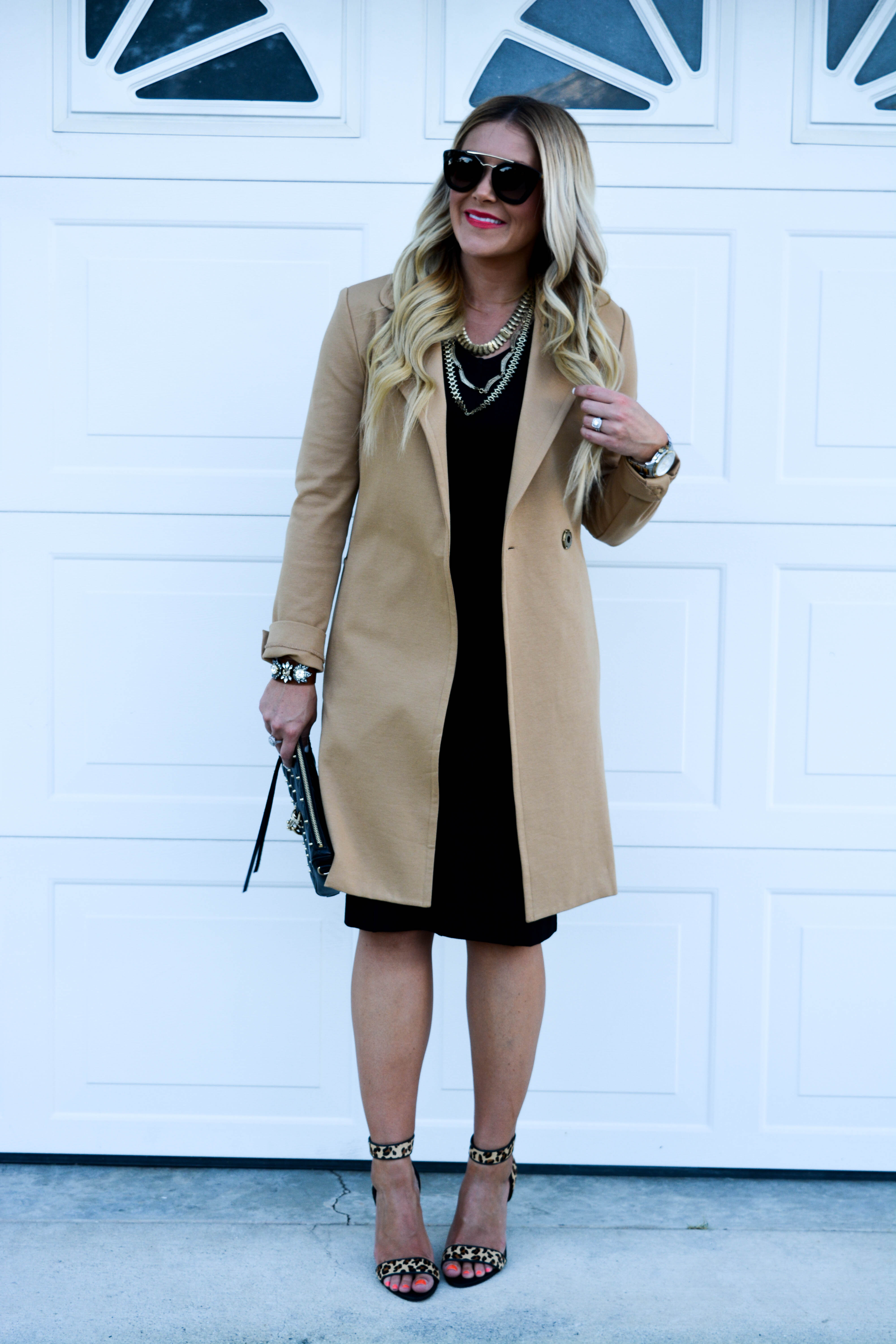 Camel Coat: cabi | Dress: cabi | Necklace: cabi | Cuff: cabi | Bag: Rebecca Minkoff | Sunnies: Prada c/o Ditto | Heels: Gilt | Lips: Trout Pout by Butter London